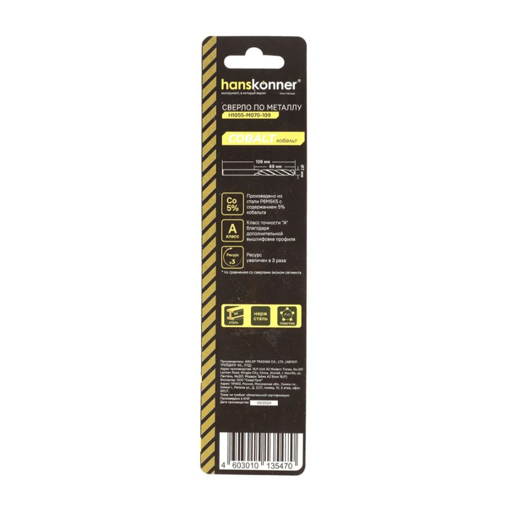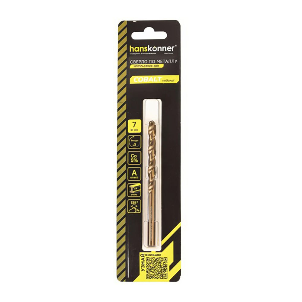 Сверло по металлу кобальт 7,0 мм Hanskonner - представляет собой надежный инструмент для работы с металлическими материалами. Изготовленное из высококачественной стали, оно обеспечивает долговечность и устойчивость к износу. Спиральная форма стружкоотвода способствует эффективному удалению стружки, что улучшает производительность и точность сверления. Цилиндрический хвостовик обеспечивает надежную фиксацию в патроне, а угол заточки 135 градусов способствует легкому началу сверления и снижает риск смещения. Это сверло идеально подходит для профессионального использования, обеспечивая высокую точность и качество обработки.