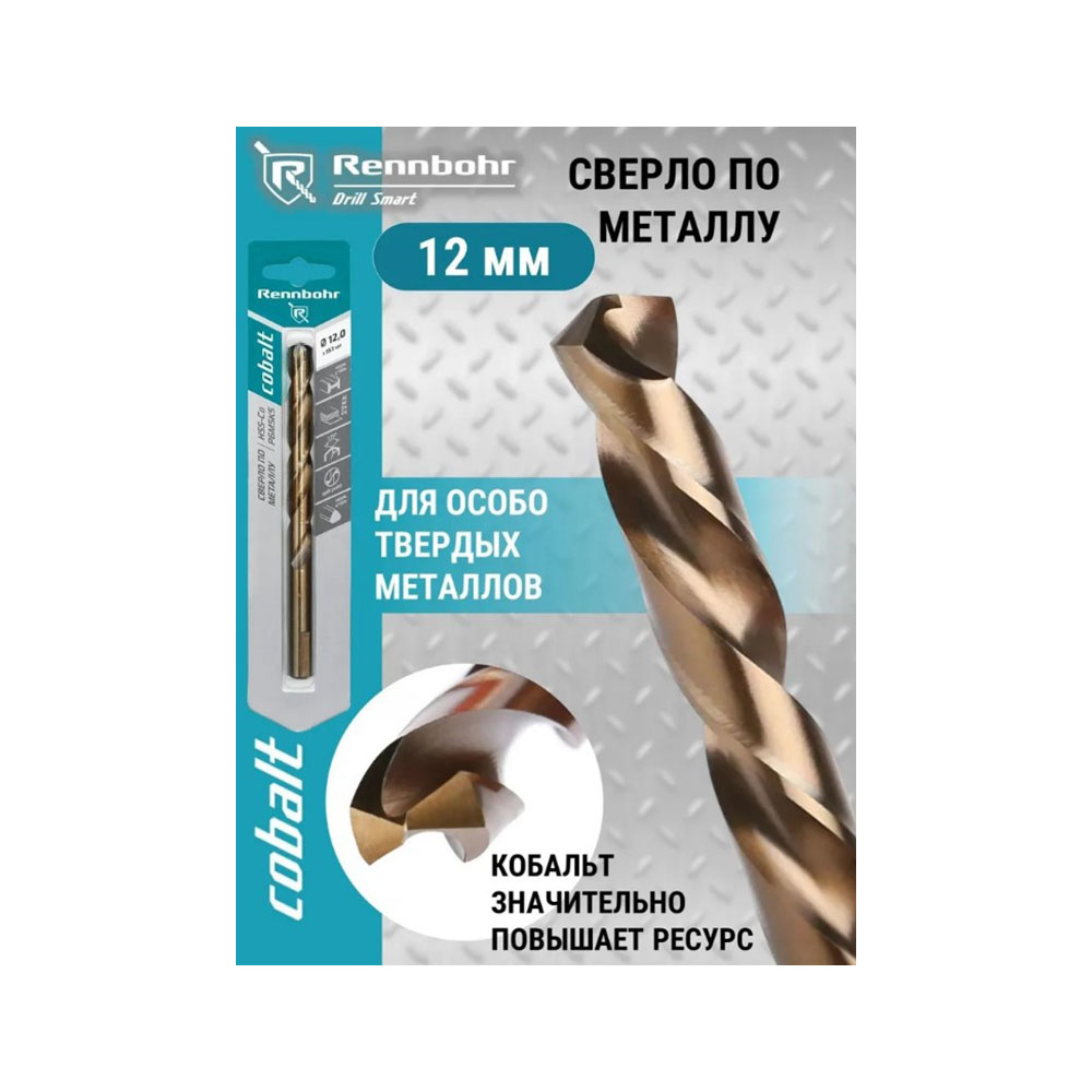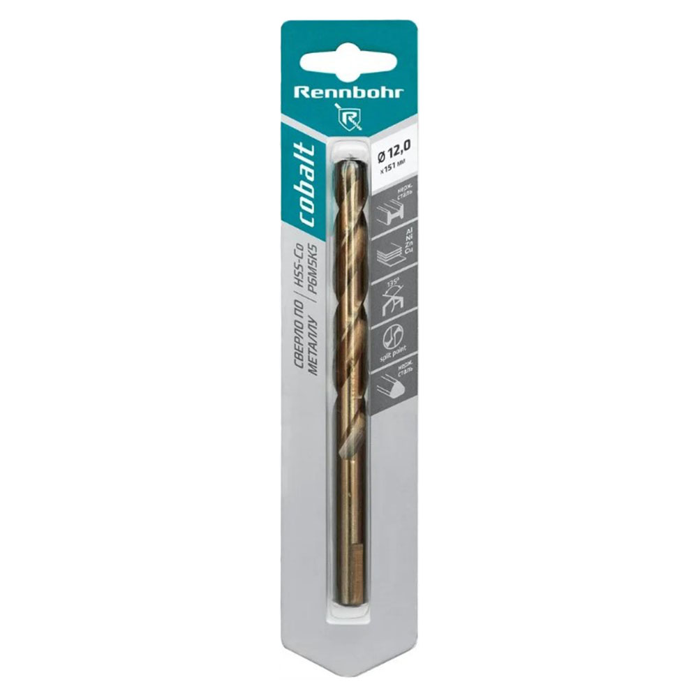 Сверло по металлу кобальтовое 12,0 мм RENNBOHR COBALT - применяется для сверления отверстий в нержавеющих сталях, жаропрочных и жаростойких сталях, легированных, высокопрочных конструкционных сталях на универсальном оборудовании, специальных станках с ЧПУ и автоматических линиях. Возможно сверление отверстия глубиной более 4 диаметров без вывода сверла для удаления стружки.
