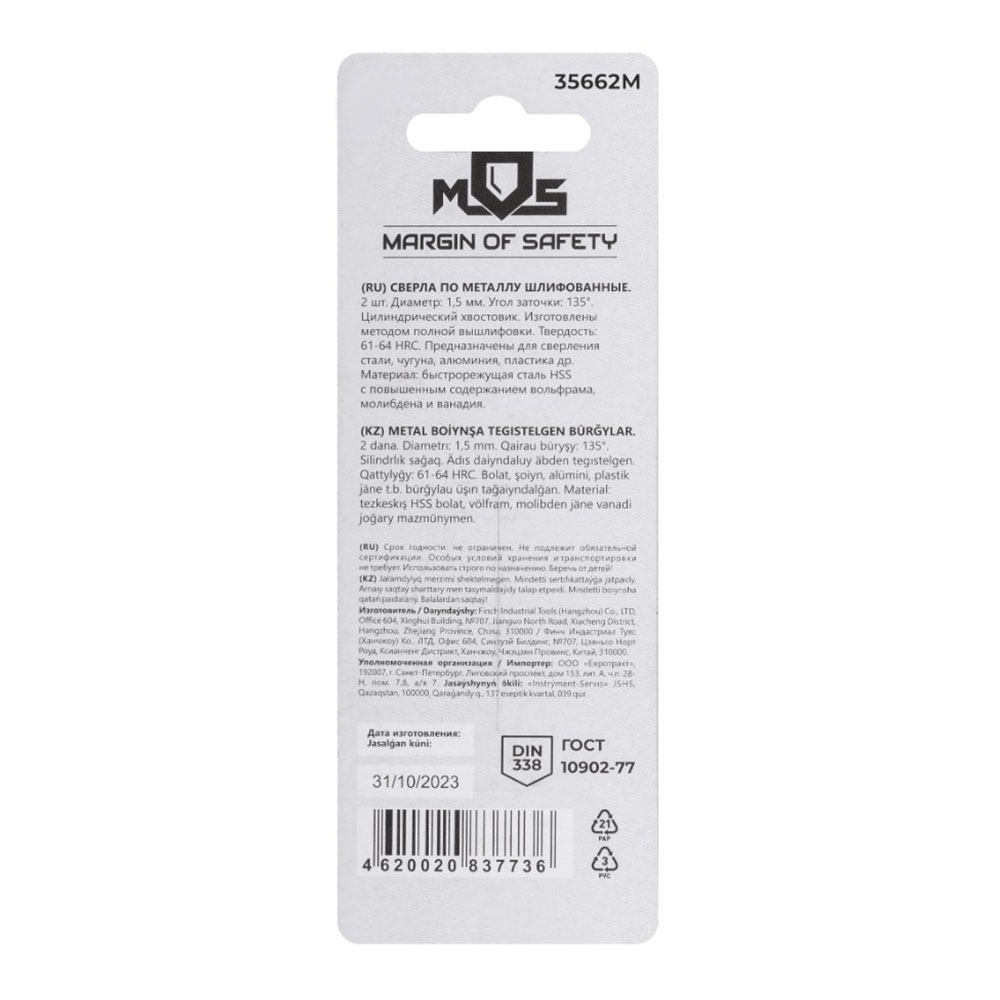 Сверло по металлу 1,5 мм 2 шт MOS - предназначены для сверления стали, чугуна, тонкого алюминия, пластика и др. Подходят как профессионалам, так и домашним мастера! Сверла изготовлены качественным методом производства — полная вышлифовка (Fully Ground), что позволило повысить точность сверления и добиться максимально эффективного отвода стружки. При производстве используется высококачественная быстрорежущая сталь с повышенным содержанием вольфрама, молибдена и ванадия, что значительно увеличивает ресурс и прочность сверл. Благодаря профессиональному углу заточки 135 градусов можно сверлить различные материалы без предварительного кернения.