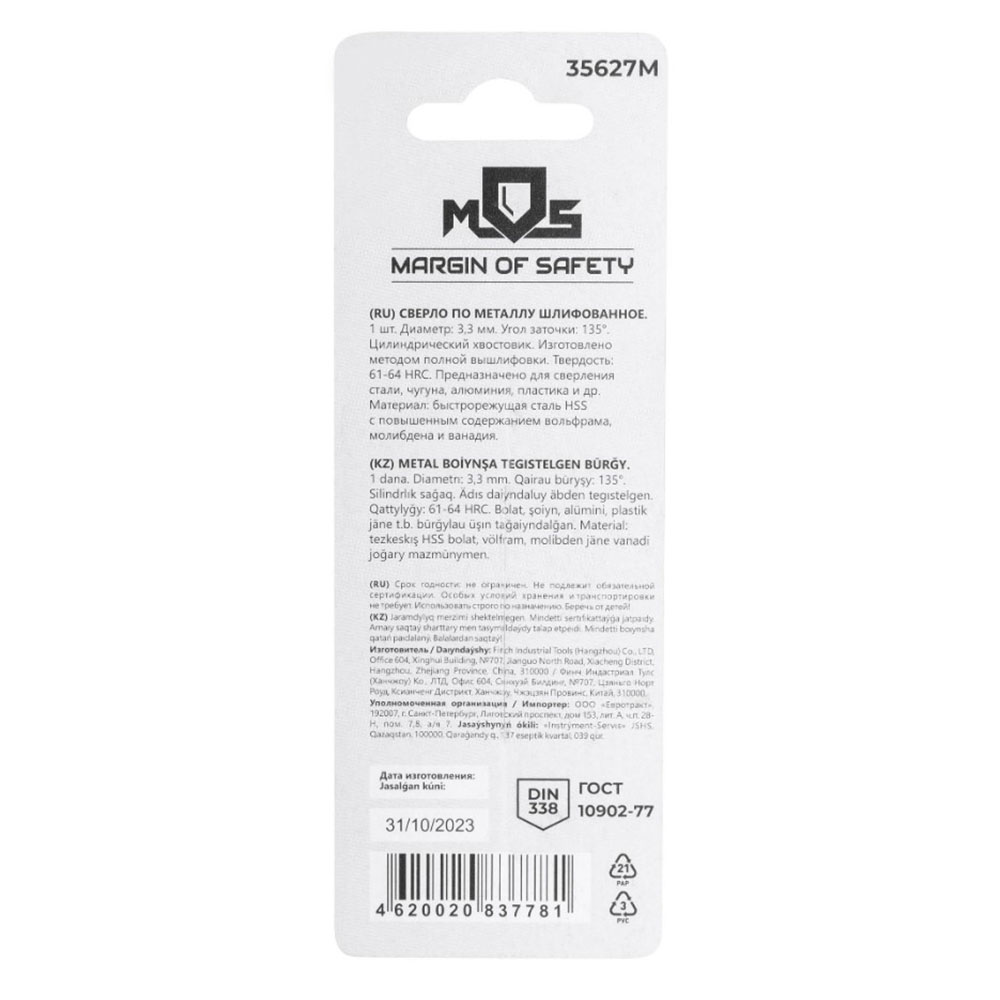 Сверло по металлу 3,3 мм 1 шт MOS - предназначено для сверления стали, чугуна, тонкого алюминия, пластика и др. Подходит как профессионалам, так и домашним мастерам! Сверла изготовлены качественным методом производства — полная вышлифовка (Fully Ground), что позволило повысить точность сверления и добиться максимально эффективного отвода стружки. При производстве используется высококачественная быстрорежущая сталь с повышенным содержанием вольфрама, молибдена и ванадия, что значительно увеличивает ресурс и прочность сверл. Благодаря профессиональному углу заточки 135 градусов можно сверлить различные материалы без предварительного кернения.