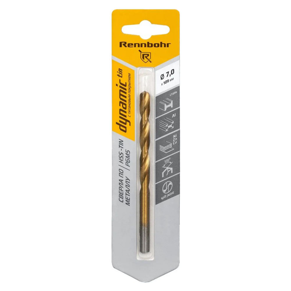 Сверло по металлу ЦХ 7 мм Rennbohr CARD - предназначено для обработки легированных и углеродистых сталей, цветных металлов, чугуна, пластмассы. Изготовлено из быстрорежущей стали Р6M5 с покрытием TiN (нитрид титан). Покрытие увеличивает скорость сверления и общий ресурс сверла.