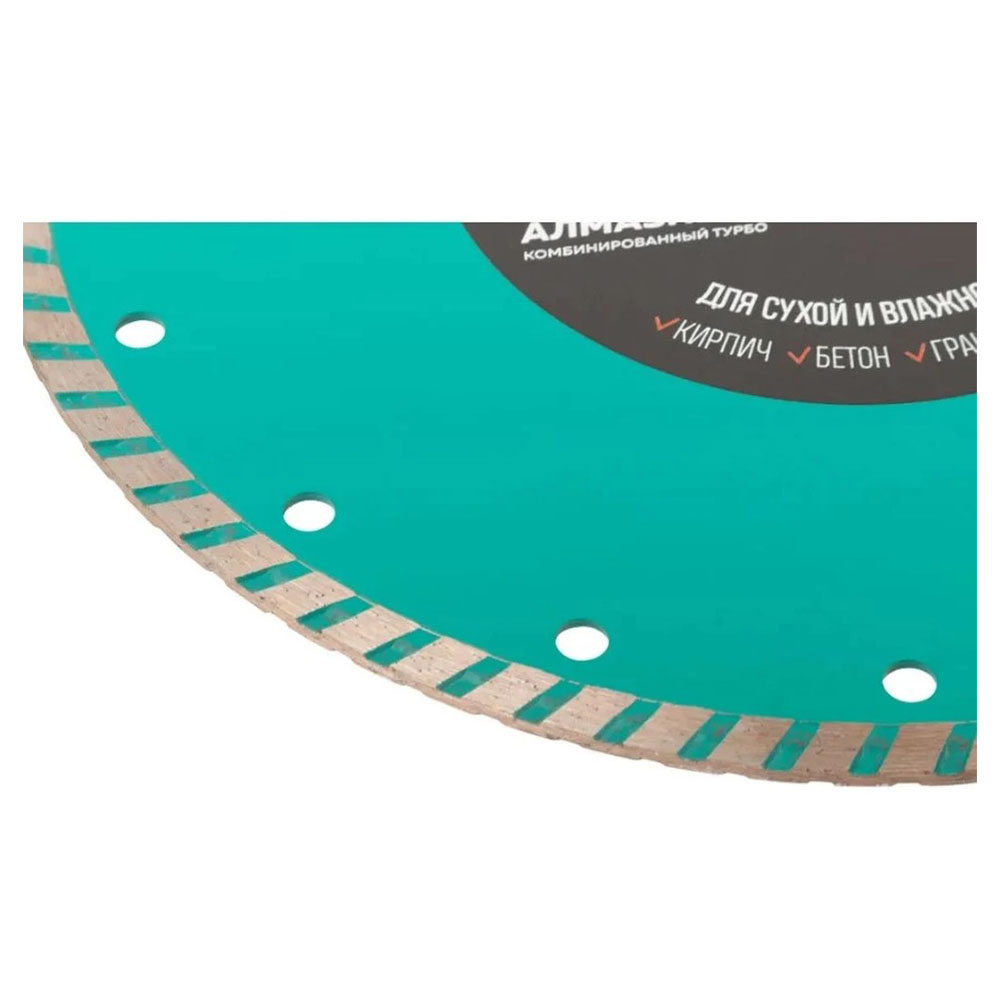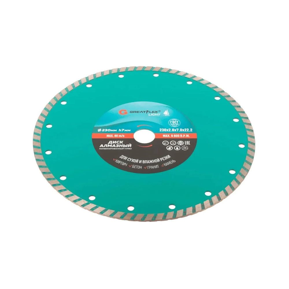 Диск алмазный комбинированный турбо 230х2,6х7,0х22,2 мм GreatFlex Light - предназначен для сухой и влажной резки бетона, кирпича, гранита и камня. Влажная резка увеличивает срок службы и производительность. Материал: инструментальная сталь, режущая кромка содержит порошок из технических алмазов.
