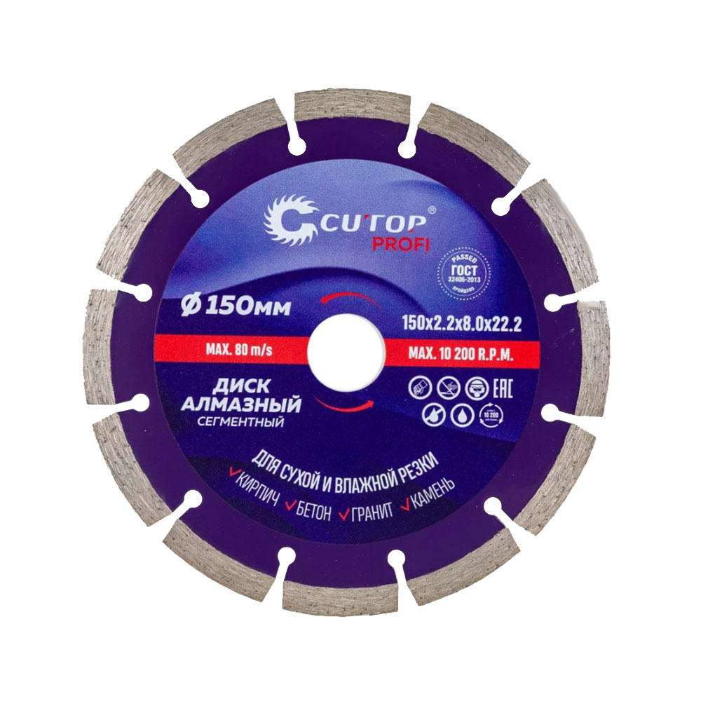Диск алмазный сегмент 150х2,2х22,2 мм CUTOP Profi - разработанный специально для профессионального использования, этот алмазный диск демонстрирует поразительную стойкость к износу и исключительный ресурс. Его диаметр 150 мм, толщина 2,2 мм и посадочный диаметр 22,2 мм обеспечивают оптимальные параметры для работы с широким спектром угловых шлифовальных машин (УШМ). Сегментированная конструкция способствует эффективному отводу тепла и шлама, предотвращая перегрев и повышая скорость реза.