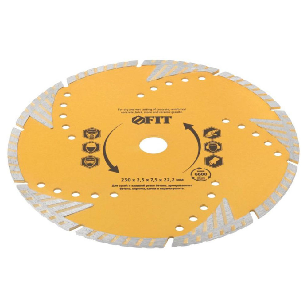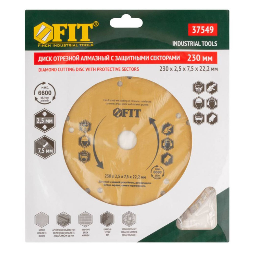 Диск алмазный сухой и влажны рез 230х2,5х7,5х22,2 мм FIT, за счет специально подобранных компонентов металлической связки диск подходит для резки армированного бетона. Защитные сектора диска обеспечивают защиту режущего слоя от бокового износа. Материал: высокоуглеродистая инструментальная сталь, режущая кромка содержит порошок из технических алмазов.