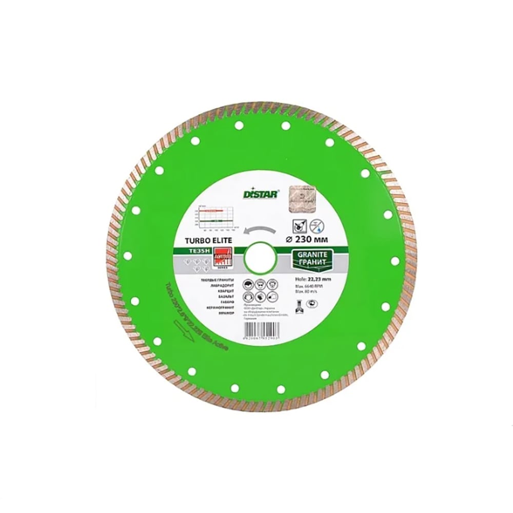 Данный диск предусматривает турбо-кромку. Он применяется при работе на болгарке и предназначен специально для резки цветных пород гранита, а также твердого песчаника. Предусматривает профессиональное использование. При резке не нуждается в охлаждении. Имеет высокий ресурс и хорошую скорость резки