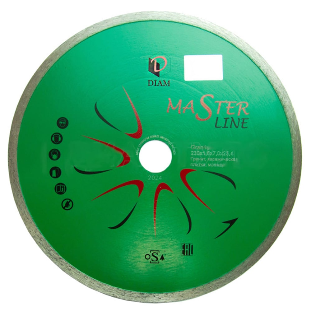 Оснащен алмазной сплошной режущей кромкой, что позволяет производить тонкий рез без сколов. Отличается высокой производительностью и продолжительным ресурсом. Эксплуатировать только с водяным охлаждением.