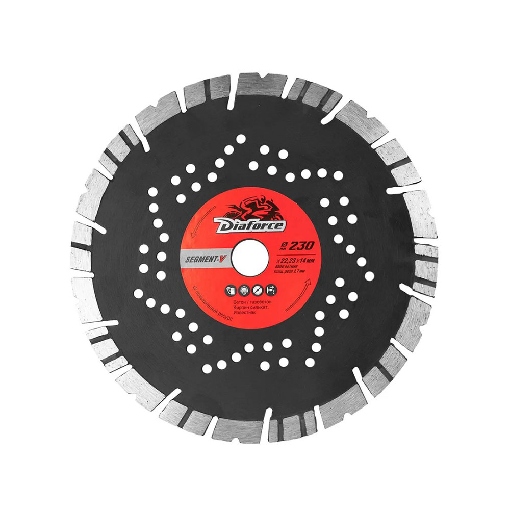 Круг алмазный 230х22,23х14х2,7 мм Diaforce Segment-V - справится с любой задачей. Одна из ключевых особенностей этого диска – рифленые сегменты с увеличенной высотой режущей кромки 14 мм. Они обеспечивают высокую скорость работы и высокий ресурс. Благодаря перфорации корпуса, диск дополнительно охлаждается во время работы, что продлевает его срок службы. Процесс производства методом горячего прессования придает диску прочность и долговечность.