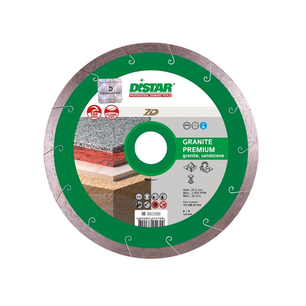 Диск алмазный Granite Premium DiStar предназначен для плиткорезных станков. Применяется для мокрого реза гранита и мрамора. Диск обладает высоким ресурсом и обеспечивает качественный, быстрый рез.