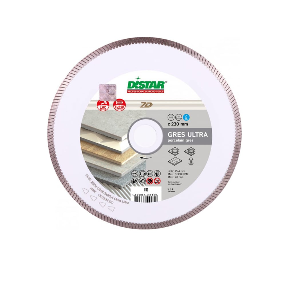 Диск алмазный сплошной Gres Ultra DiStar предназначен для плиткорезных станков. Применяется для мокрого реза керамической плитки, керамогранита и мрамора. Диск обеспечивает высокую скорость реза.