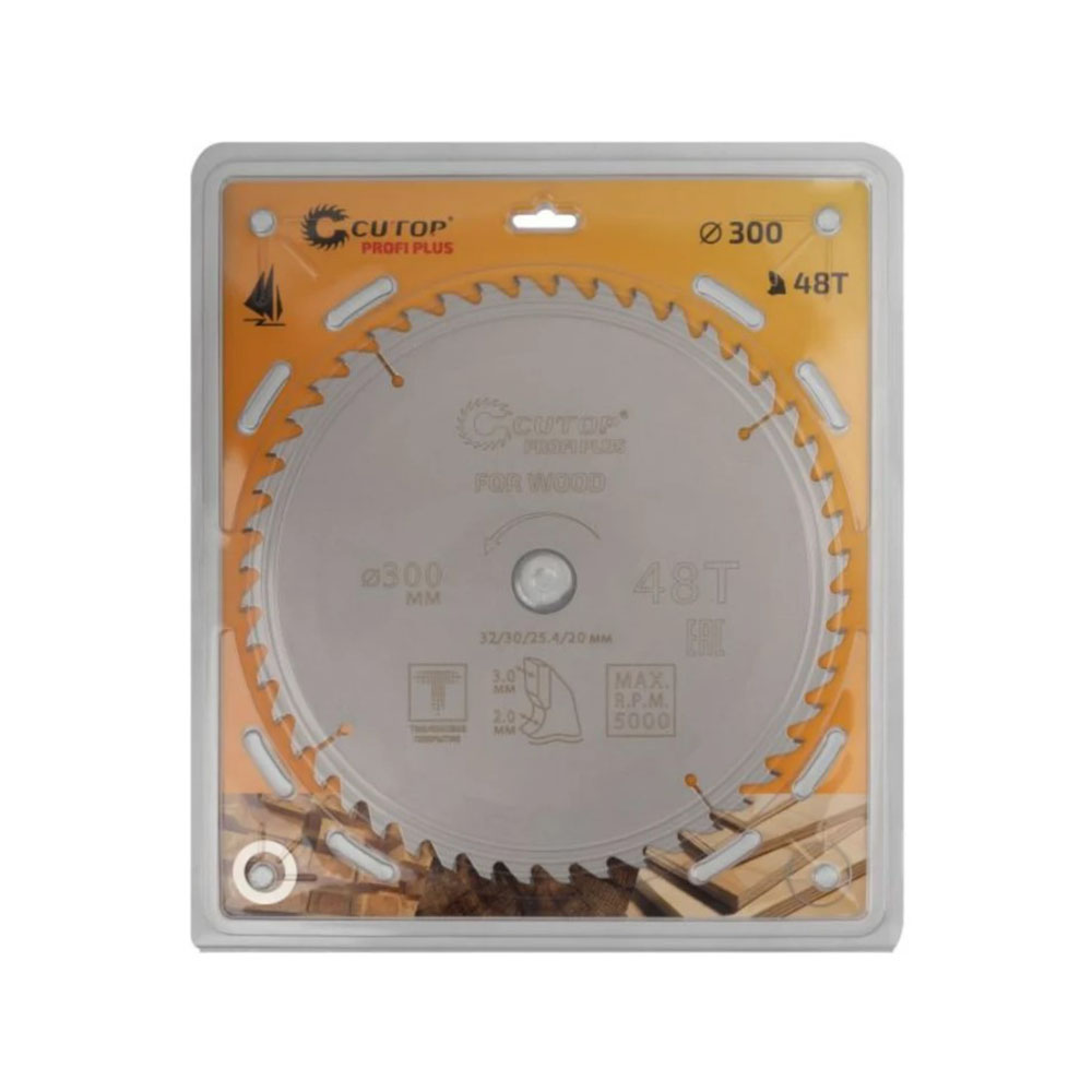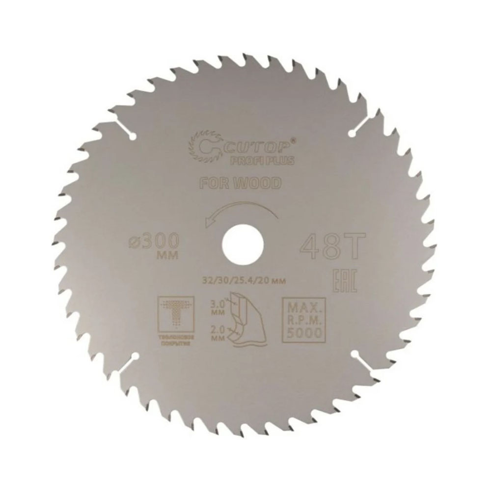 Диск пильный 300х32/30/25,4/20 мм 48Т CUTOP - с тефлоновым покрытием по дереву Profi plus 300x2/3x32/30/25.4/20 мм, 48Т CUTOP 75-30048Т используется совместно с циркулярными и торцовочными пилами для продольного и поперечного реза. Предназначен для распила мягких и твердых пород древесины, МДФ, фанеры. Диск имеет тефлоновое покрытие и компенсационные пазы, которые способствуют быстрому теплоотводу. Благодаря этому рез получается ровный, а диск не деформируется и имеет более длительный срок службы. Изготавливается в специальной автоматической индукционной машине, которая обеспечивает более гладкую поверхность и острые зубья. Материал: инструментальная сталь, карбидные зубья.