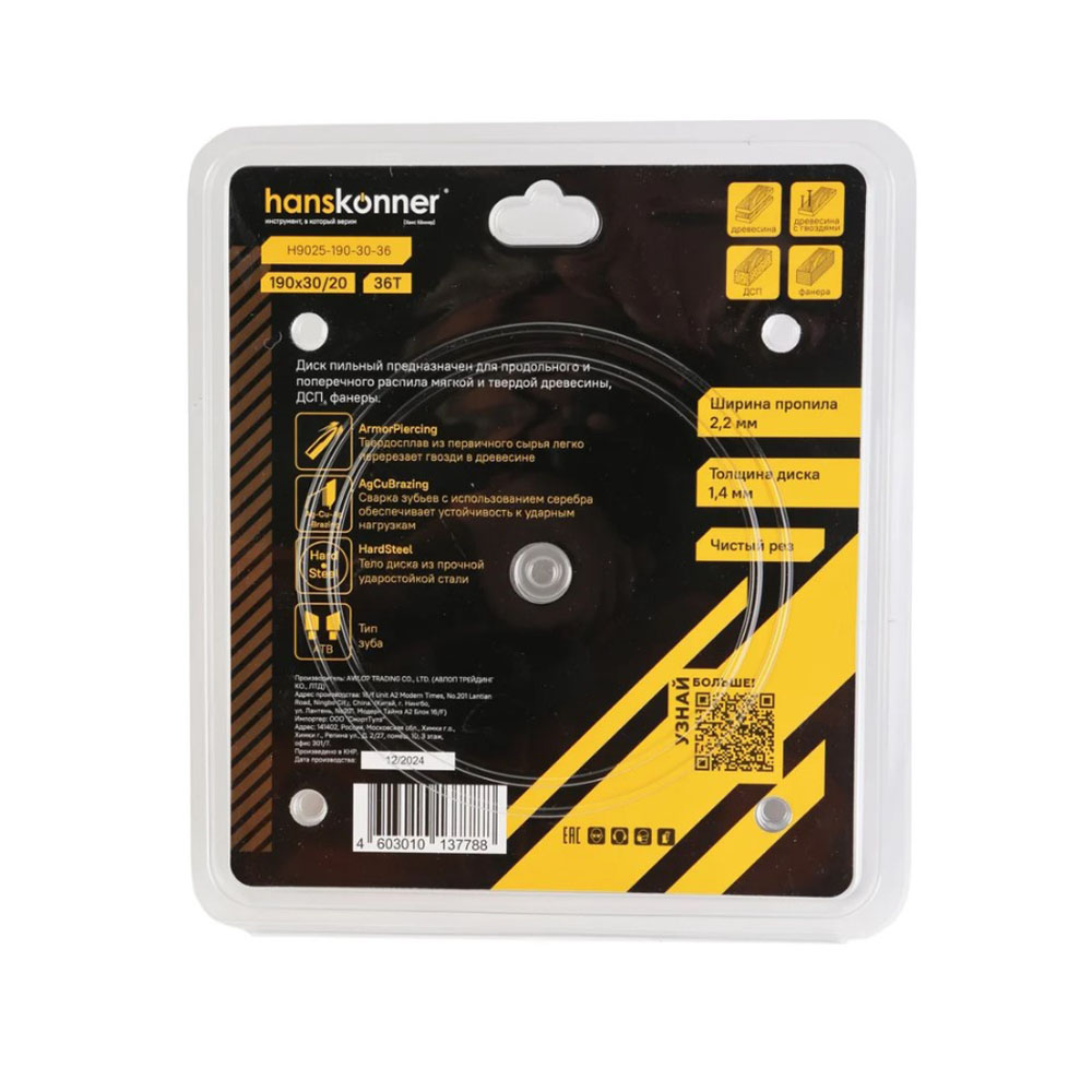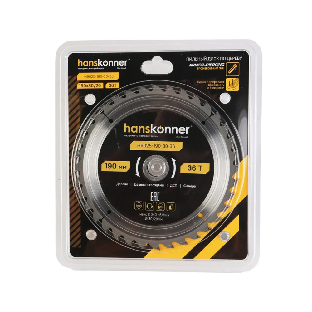 Диск пильный по дереву 130-30/20-36 зуба Hanskonner - применяется для продольного и поперечного распила мягкой и твердой древесины, фанеры, ДСП, ламината, пластика и плитных материалов. ArmorPiercing -Твердосплав из первичного сырья легко перерезает древесину с гвоздями. AgCuBrazing-сварка зубьев с использованием серебра обеспечивает устойчивость к ударным нагрузкам. HardSteel-тело диска из прочной ударостойкой стали.