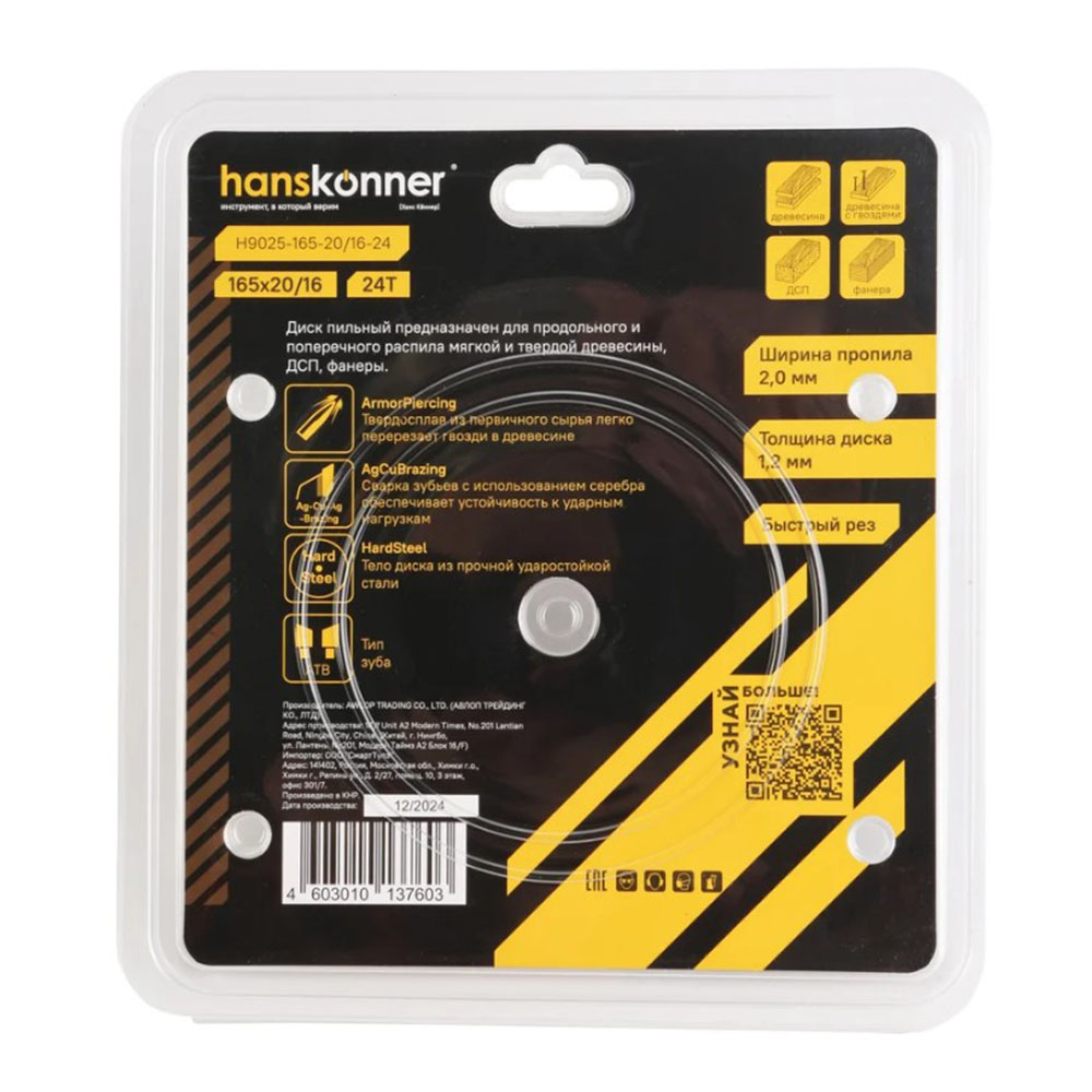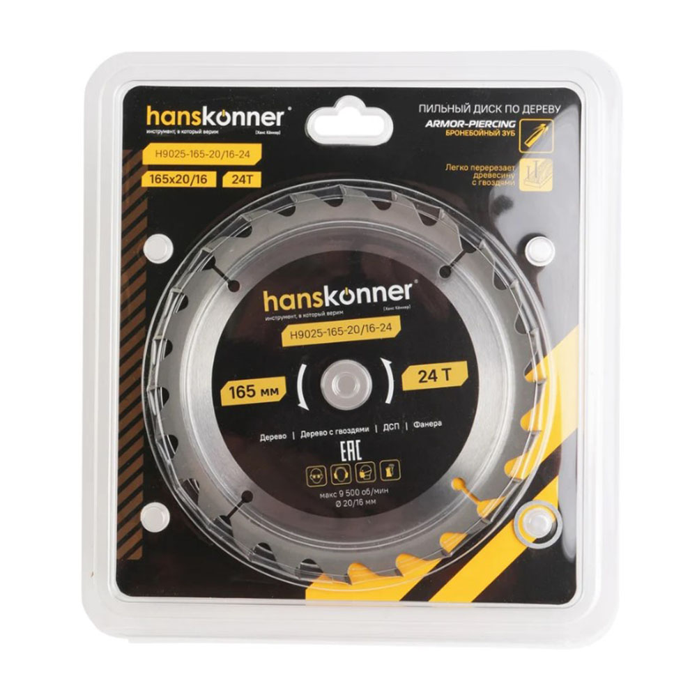 Диск пильный по дереву 165-20/16 24 зуба Hanskonner - применяется для продольного и поперечного распила мягкой и твердой древесины, фанеры, ДСП, ламината, пластика и плитных материалов. ArmorPiercing -Твердосплав из первичного сырья легко перерезает древесину с гвоздями. AgCuBrazing-сварка зубьев с использованием серебра обеспечивает устойчивость к ударным нагрузкам. HardSteel-тело диска из прочной ударостойкой стали.