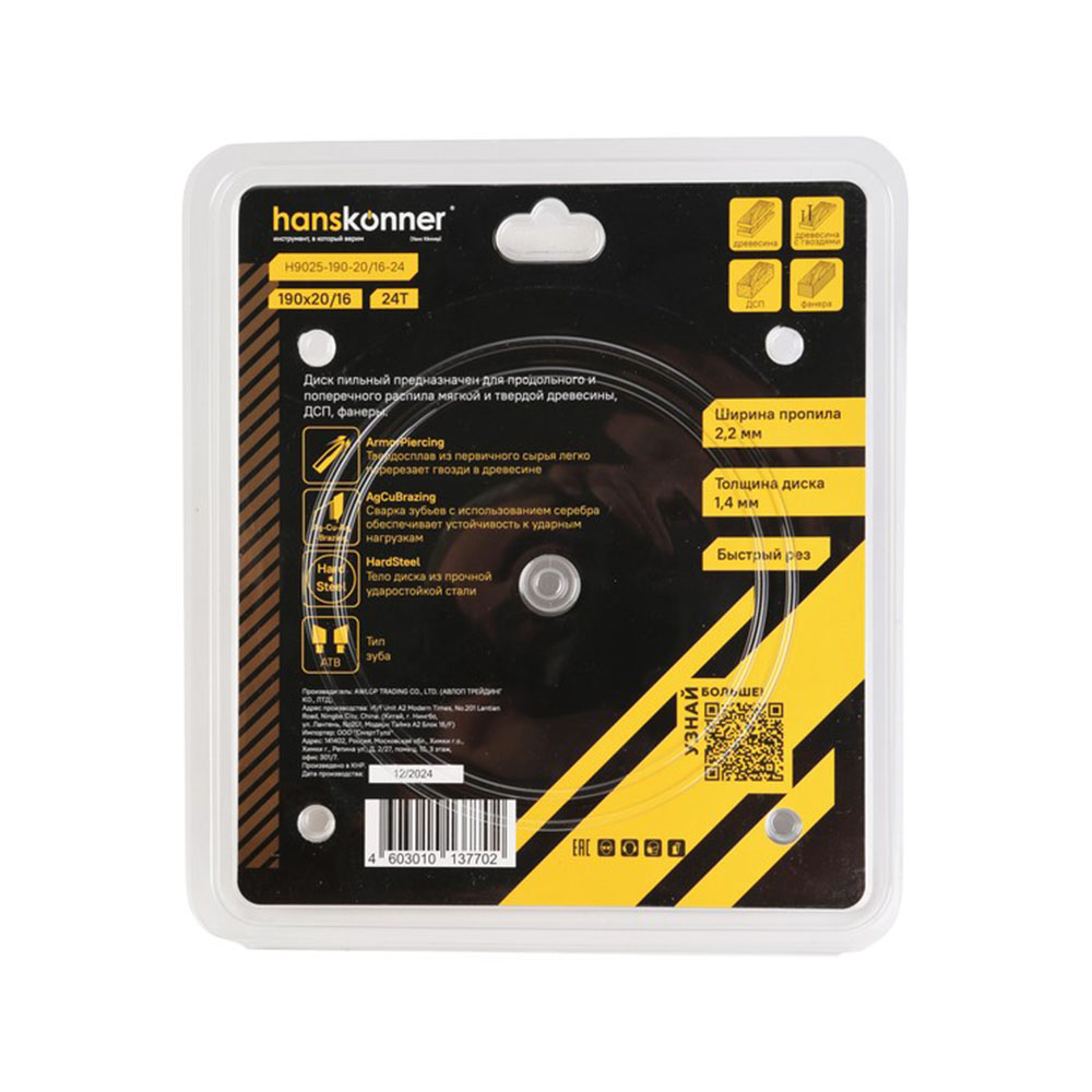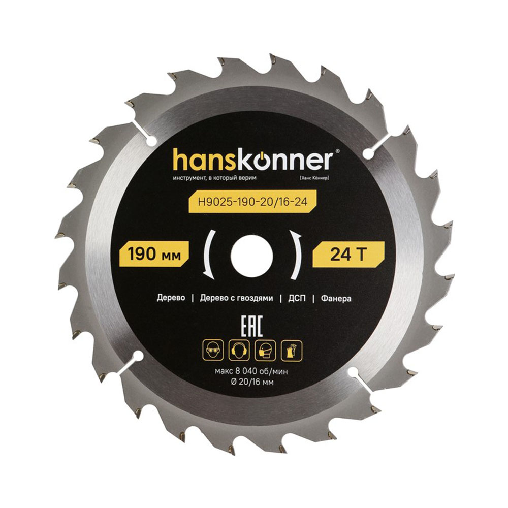 Диск пильный по дереву 190-20/16 24 зуба Hanskonner - применяется для продольного и поперечного распила мягкой и твердой древесины, фанеры, ДСП, ламината, пластика и плитных материалов. ArmorPiercing -Твердосплав из первичного сырья легко перерезает древесину с гвоздями. AgCuBrazing-сварка зубьев с использованием серебра обеспечивает устойчивость к ударным нагрузкам. HardSteel-тело диска из прочной ударостойкой стали.