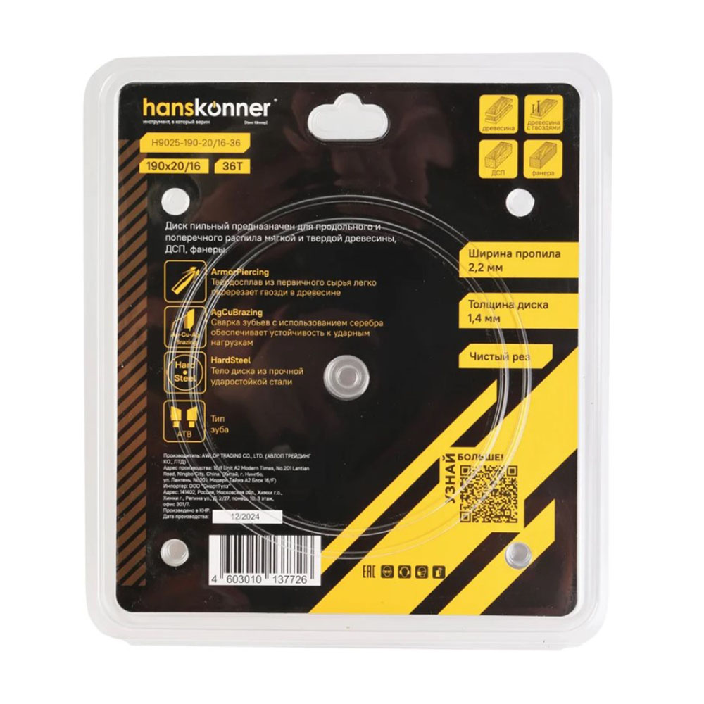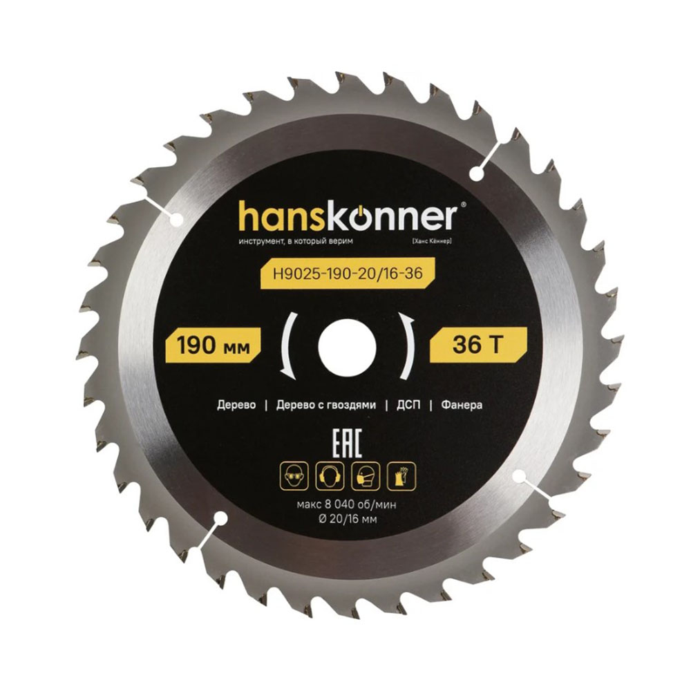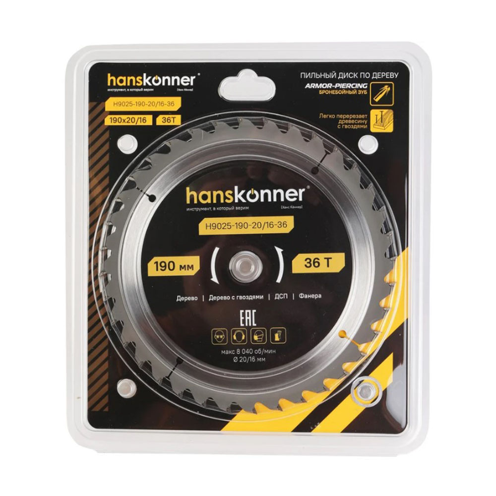 Диск пильный по дереву 190-20/16 36 зубьев Hanskonner - применяется для продольного и поперечного распила мягкой и твердой древесины, фанеры, ДСП, ламината, пластика и плитных материалов. ArmorPiercing -Твердосплав из первичного сырья легко перерезает древесину с гвоздями. AgCuBrazing-сварка зубьев с использованием серебра обеспечивает устойчивость к ударным нагрузкам. HardSteel-тело диска из прочной ударостойкой стали.