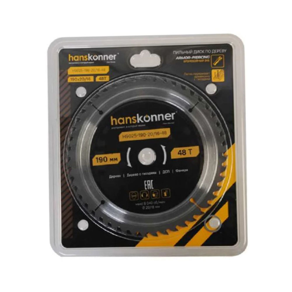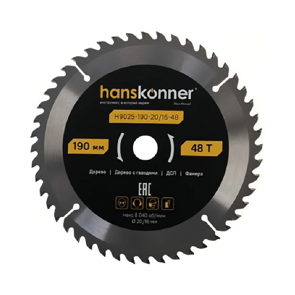 Диск пильный по дереву 190-20/16 48 зубьев Hanskonner - применяется для продольного и поперечного распила мягкой и твердой древесины, фанеры, ДСП, ламината, пластика и плитных материалов. ArmorPiercing -Твердосплав из первичного сырья легко перерезает древесину с гвоздями. AgCuBrazing-сварка зубьев с использованием серебра обеспечивает устойчивость к ударным нагрузкам. HardSteel-тело диска из прочной ударостойкой стали.