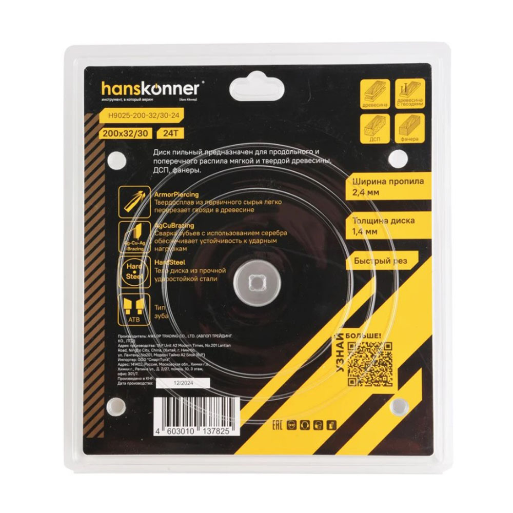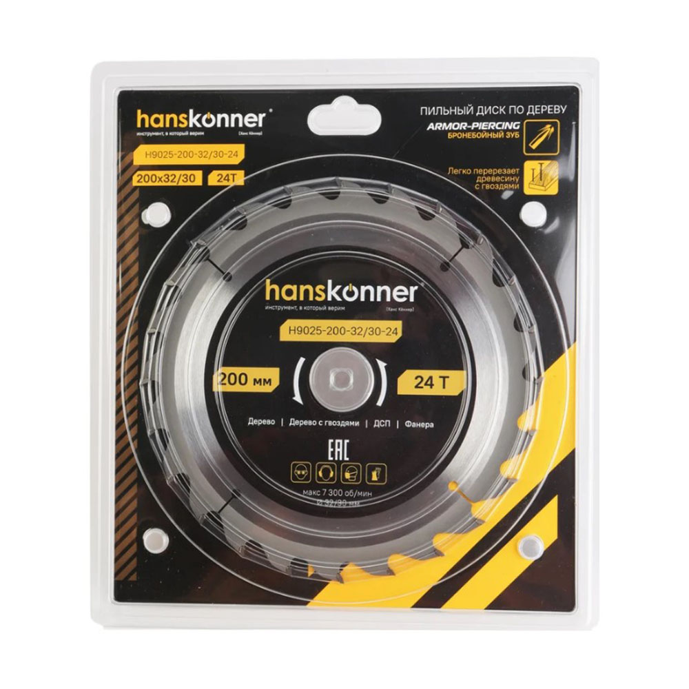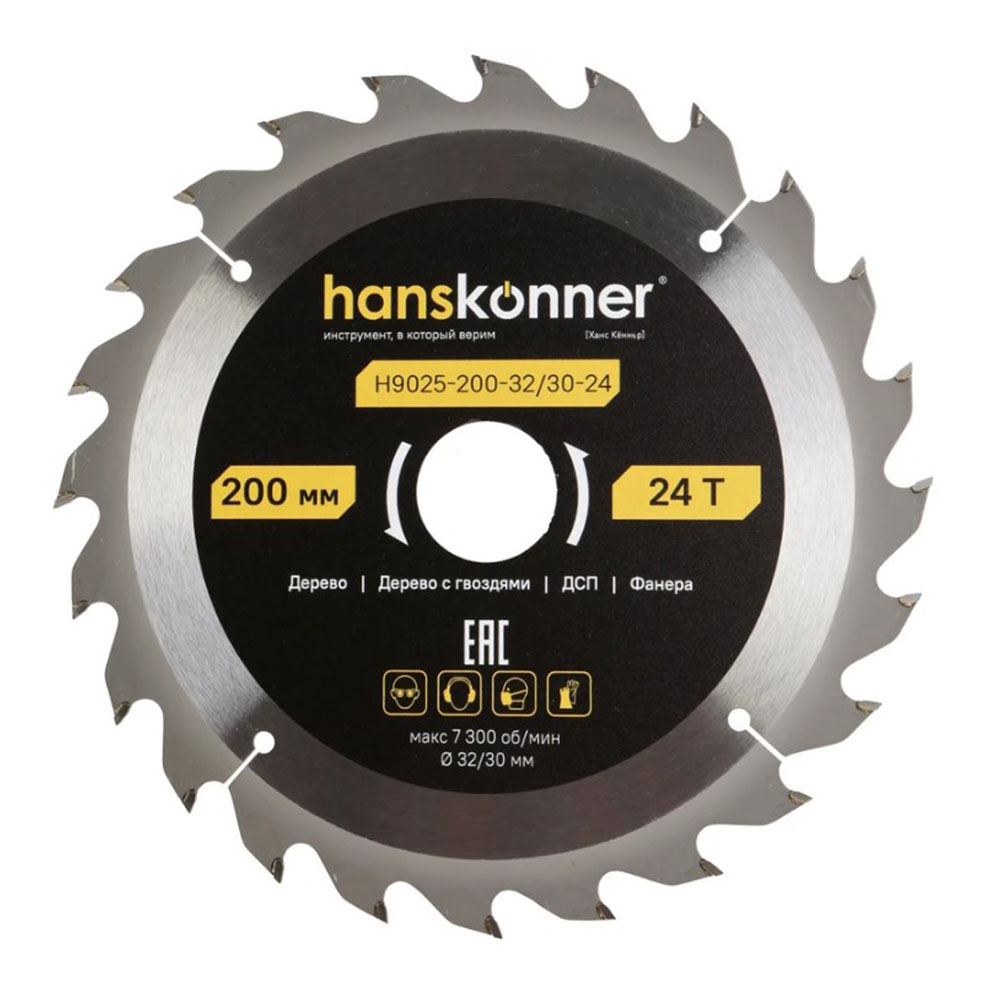 Диск пильный по дереву 200-32/30 24 зуба Hanskonner - применяется для продольного и поперечного распила мягкой и твердой древесины, фанеры, ДСП, ламината, пластика и плитных материалов. ArmorPiercing -Твердосплав из первичного сырья легко перерезает древесину с гвоздями. AgCuBrazing-сварка зубьев с использованием серебра обеспечивает устойчивость к ударным нагрузкам. HardSteel-тело диска из прочной ударостойкой стали.