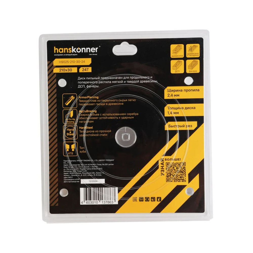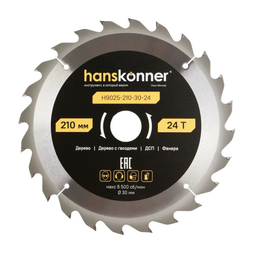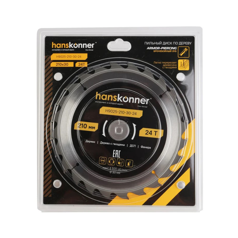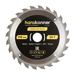 Диск пильный по дереву 210х30 24 зуба Hanskonner - применяется для продольного и поперечного распила мягкой и твердой древесины, фанеры, ДСП, ламината, пластика и плитных материалов. ArmorPiercing -Твердосплав из первичного сырья легко перерезает древесину с гвоздями. AgCuBrazing-сварка зубьев с использованием серебра обеспечивает устойчивость к ударным нагрузкам. HardSteel-тело диска из прочной ударостойкой стали.