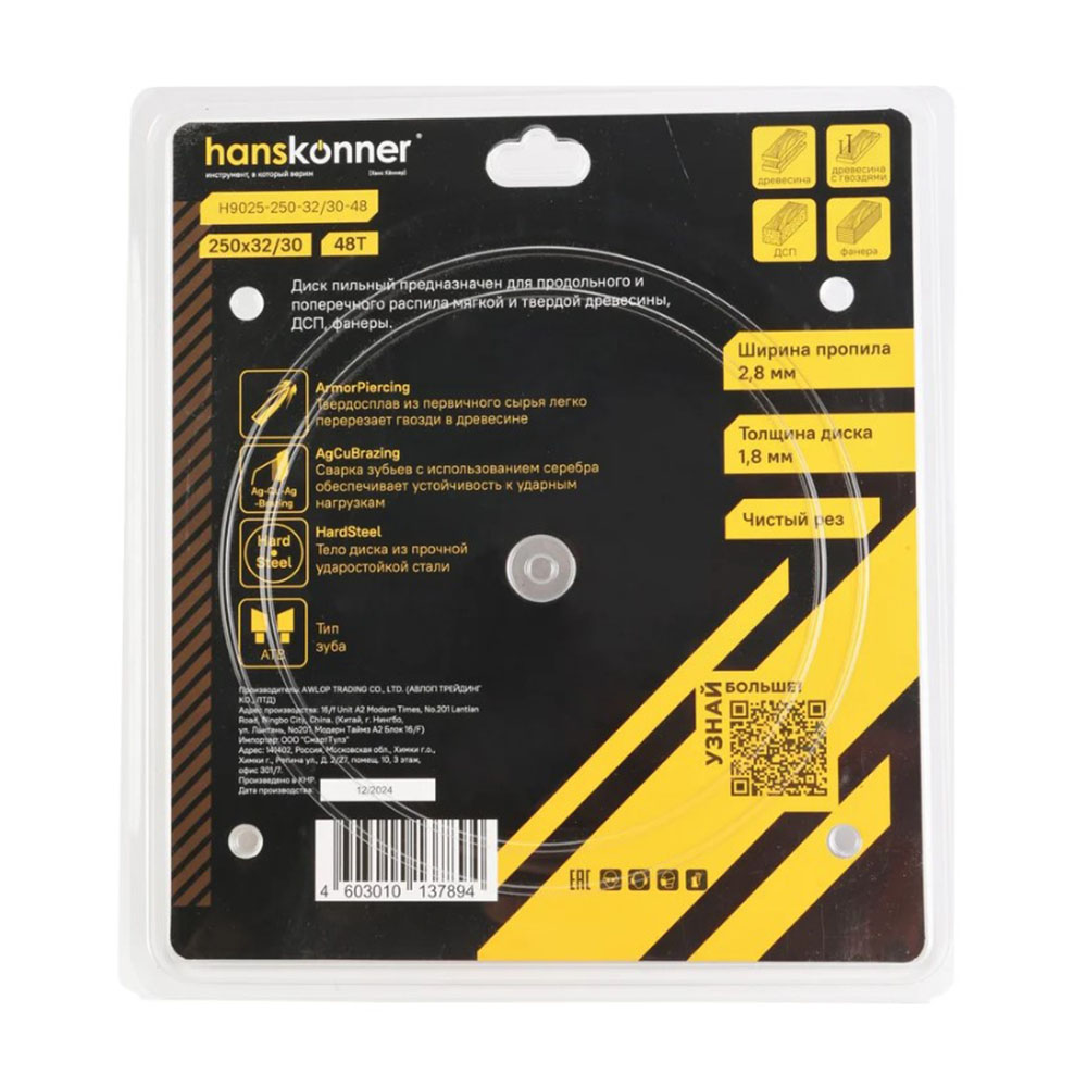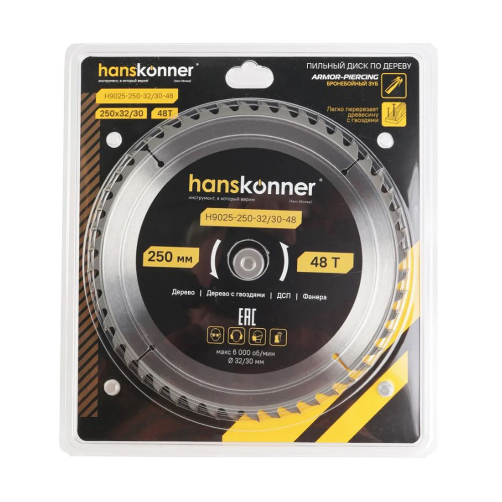 Диск пильный по дереву 250х32/30 48 зубьев Hanskonner - применяется для продольного и поперечного распила мягкой и твердой древесины, фанеры, ДСП, ламината, пластика и плитных материалов. ArmorPiercing -Твердосплав из первичного сырья легко перерезает древесину с гвоздями. AgCuBrazing-сварка зубьев с использованием серебра обеспечивает устойчивость к ударным нагрузкам. HardSteel-тело диска из прочной ударостойкой стали.