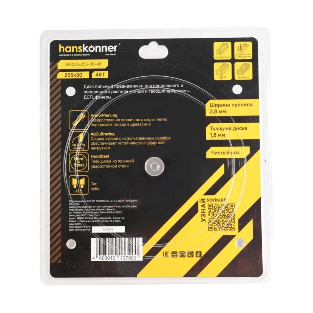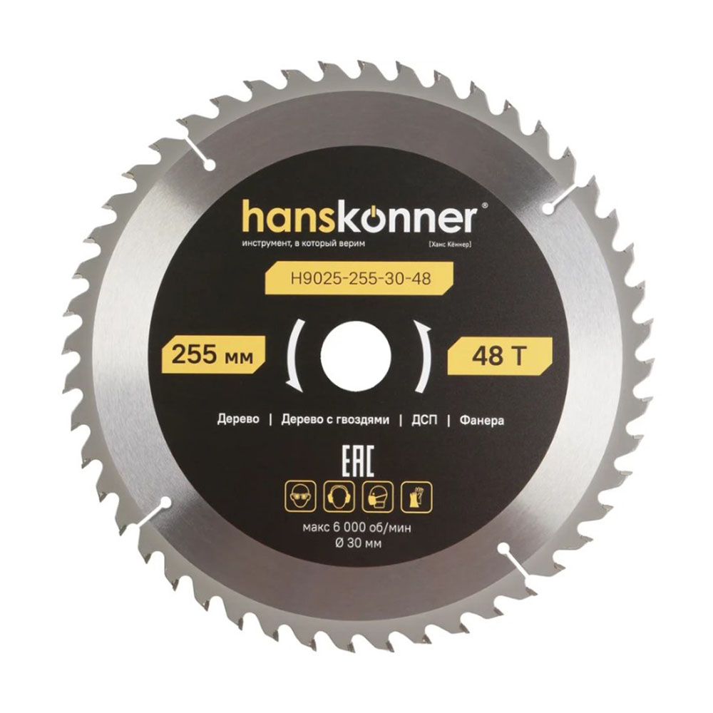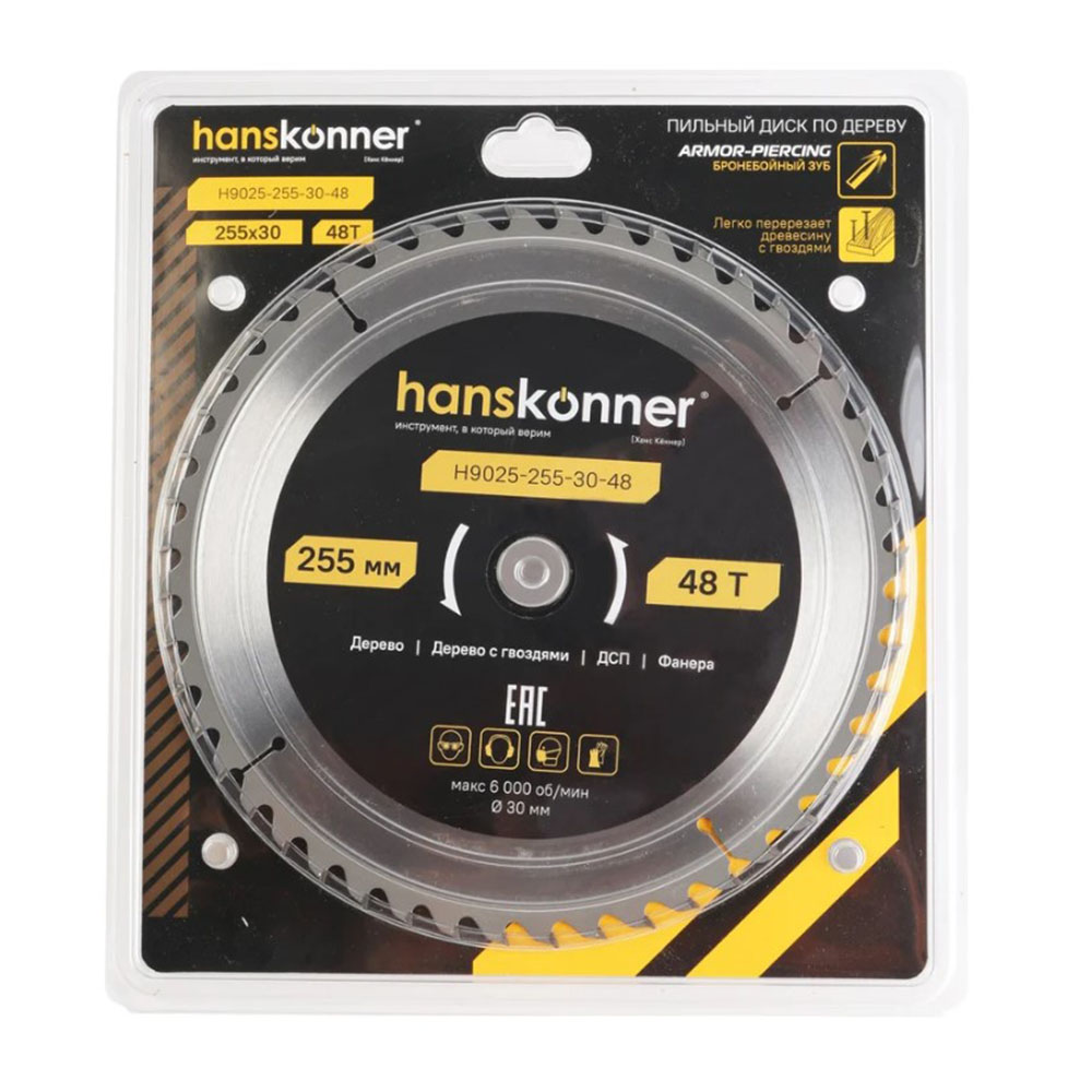 Диск пильный по дереву 255х30 48 зубьев Hanskonner - применяется для продольного и поперечного распила мягкой и твердой древесины, фанеры, ДСП, ламината, пластика и плитных материалов. ArmorPiercing -Твердосплав из первичного сырья легко перерезает древесину с гвоздями. AgCuBrazing-сварка зубьев с использованием серебра обеспечивает устойчивость к ударным нагрузкам. HardSteel-тело диска из прочной ударостойкой стали.