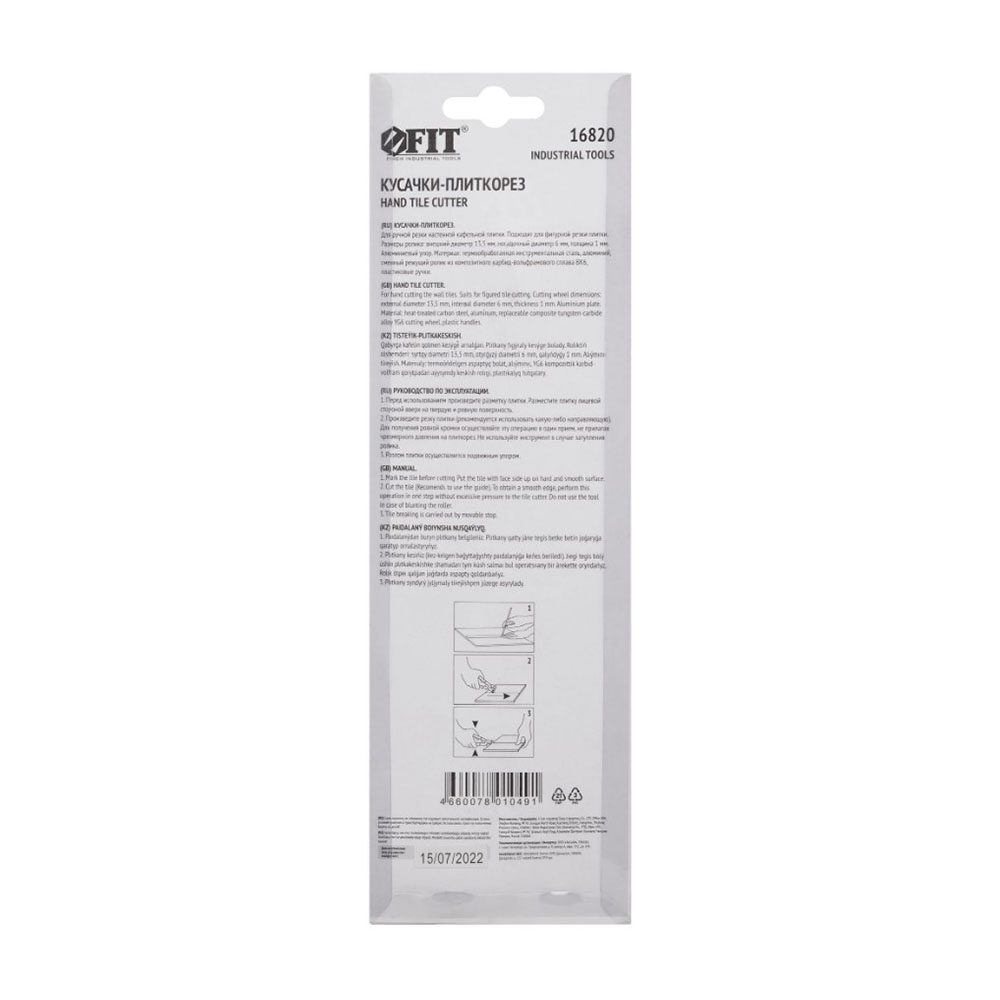 Кусачки для кафеля тип В алюминиевый упор 215 мм FIT - предназначены для ручного разреза плитки по линии произвольной формы. Кусачки выполнены из качественной инструментальной стали, что обеспечивает долгий срок службы инструмента. Твердосплавный режущий ролик имеет высокий запас прочности. ПВХ-накладки на рукоятках обеспечивают комфортный и надежный хват.