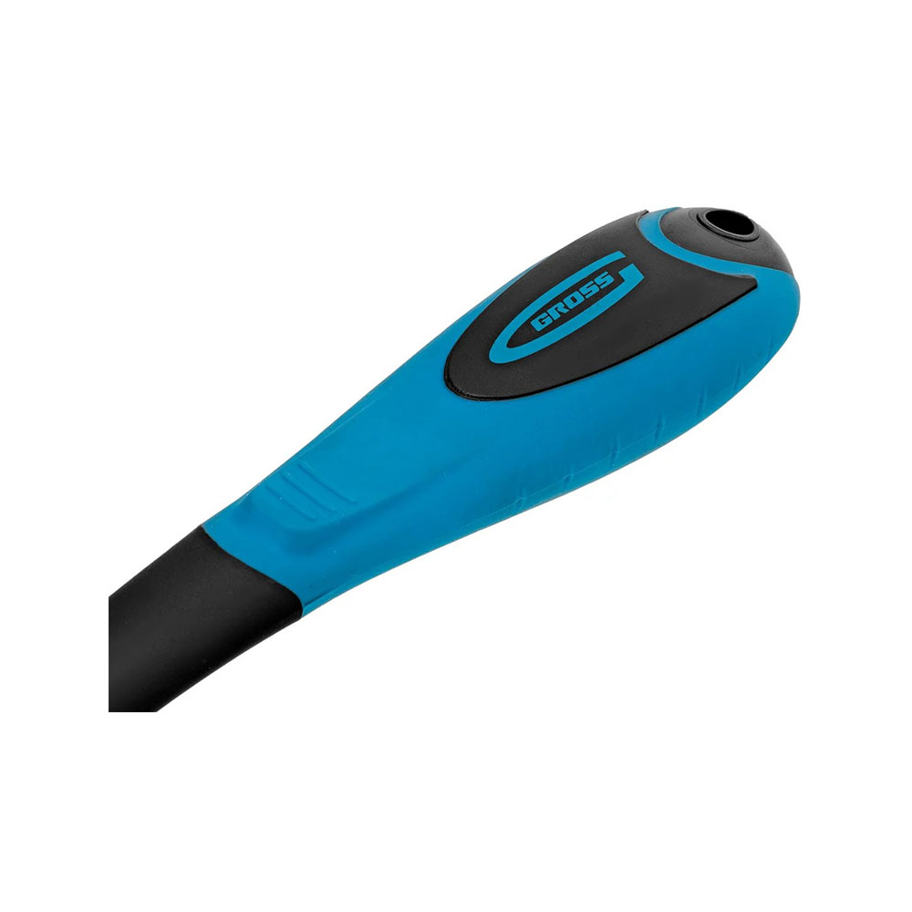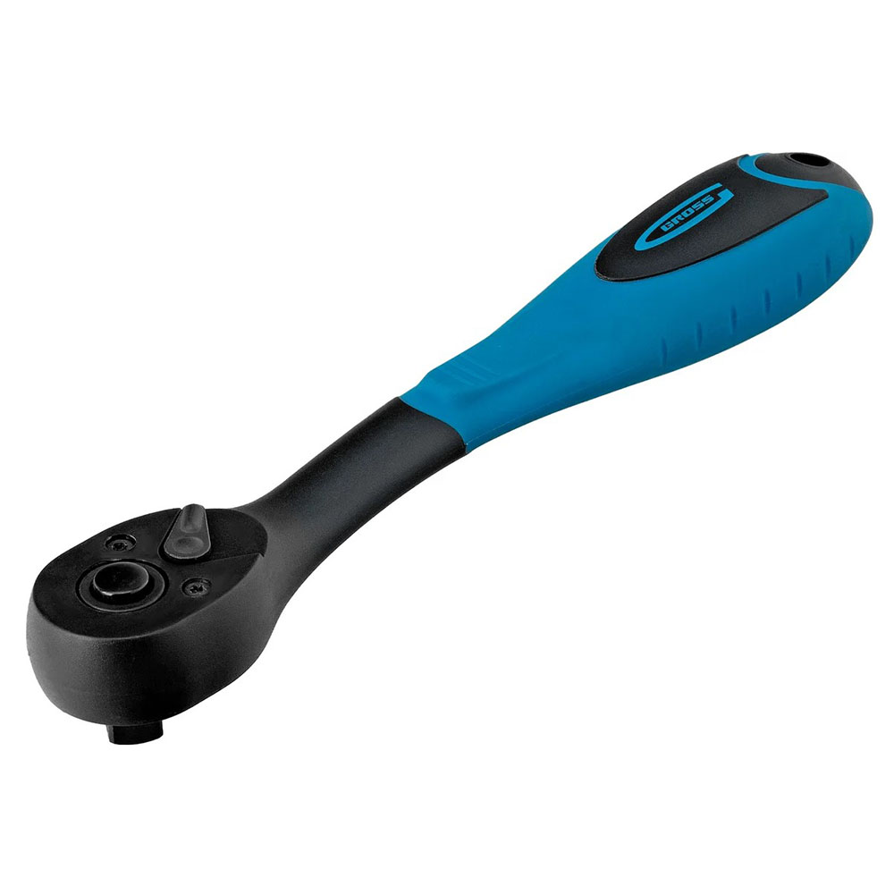 Ключ-трещотка для торцевых головок 3/8 GROSS - изготовлен из хром-ванадиевой стали. Рукоятка двухкомпонентная, покрыта полипропиленом, имеет расширенную форму - для удобного удержания в руке. Трещоточный механизм с реверсом и 72 зубьями обеспечивает исключительную мягкость и плавность в работе.