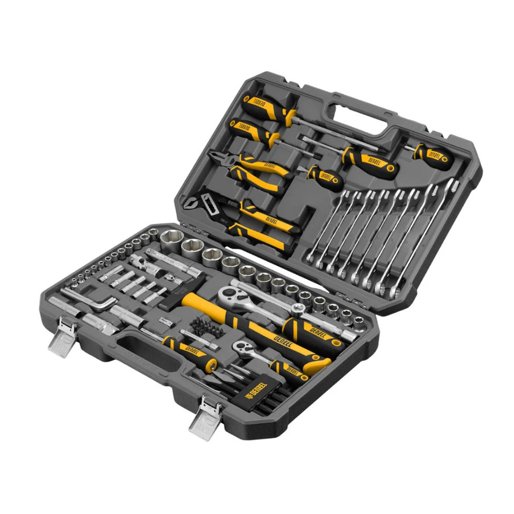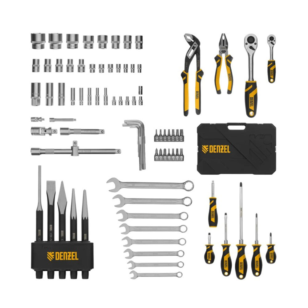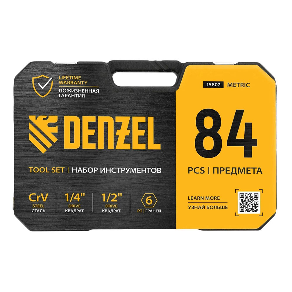 Набор инструментов 84 предмета пластиковый кейс Denzel - состоит из 84 предметов из стали CrV и S2, с присоединительными квадратами 1/4" и 1/2", и упакован во вместительный усиленный кейс собственной разработки с антивандальным покрытием. В комплект поставки входят инструменты и оснастка для монтажа и демонтажа резьбовых соединений, а также молоток, плоскогубцы, переставные клещи, кернер, бородок, зубило, крейцмейсель и выколотка для выполнения слесарных и сантехнических работ. Набор предназначен для профессионального использования в автомастерской, будет полезен для решения бытовых вопросов.