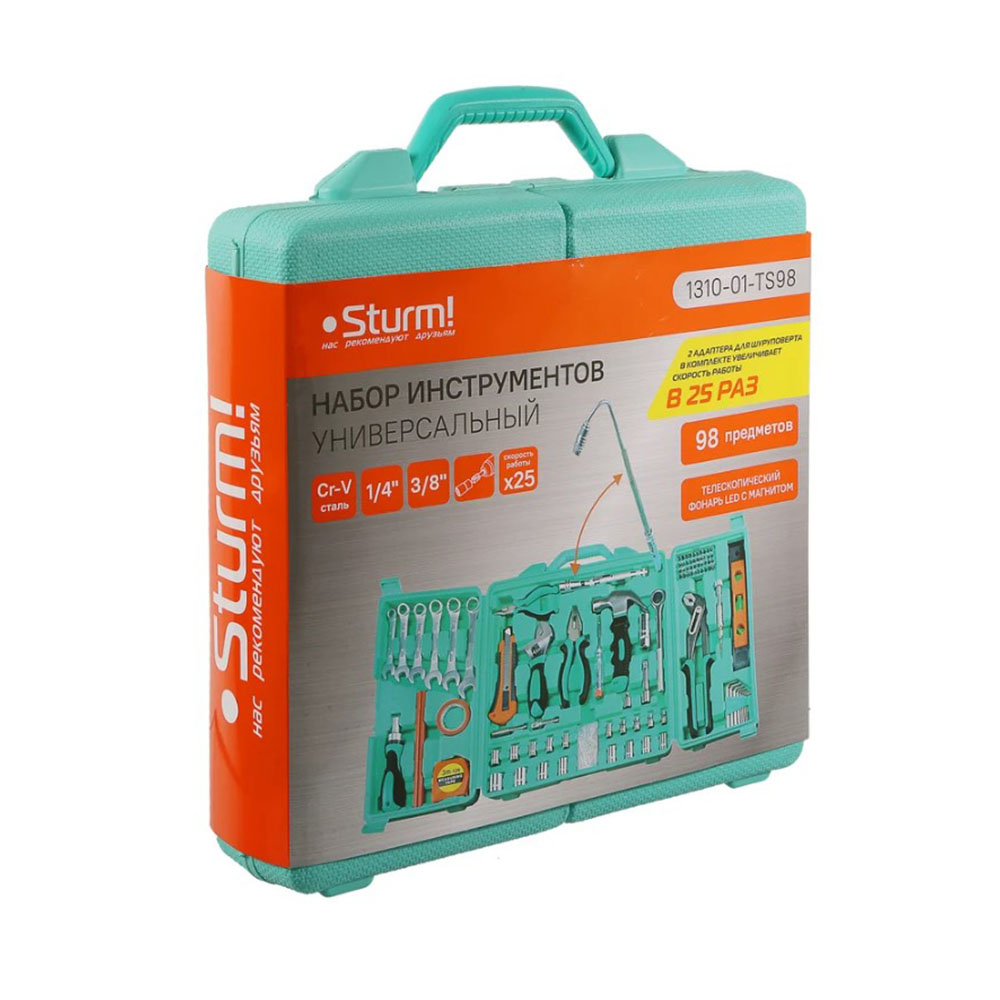 Набор инструментов 98 предметов Sturm - будет незаменимым помощником при ремонтных работах дома или в мастерской, так и при самостоятельном обслуживании и ремонте транспортных средств. Телескопический светодиодный фонарь с магнитом устанавливается в угол кейса при необходимости и ярко освещает ваше рабочее пространство.