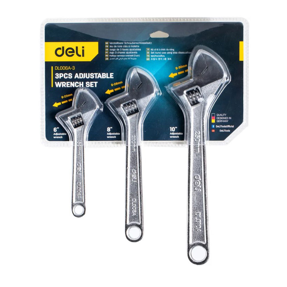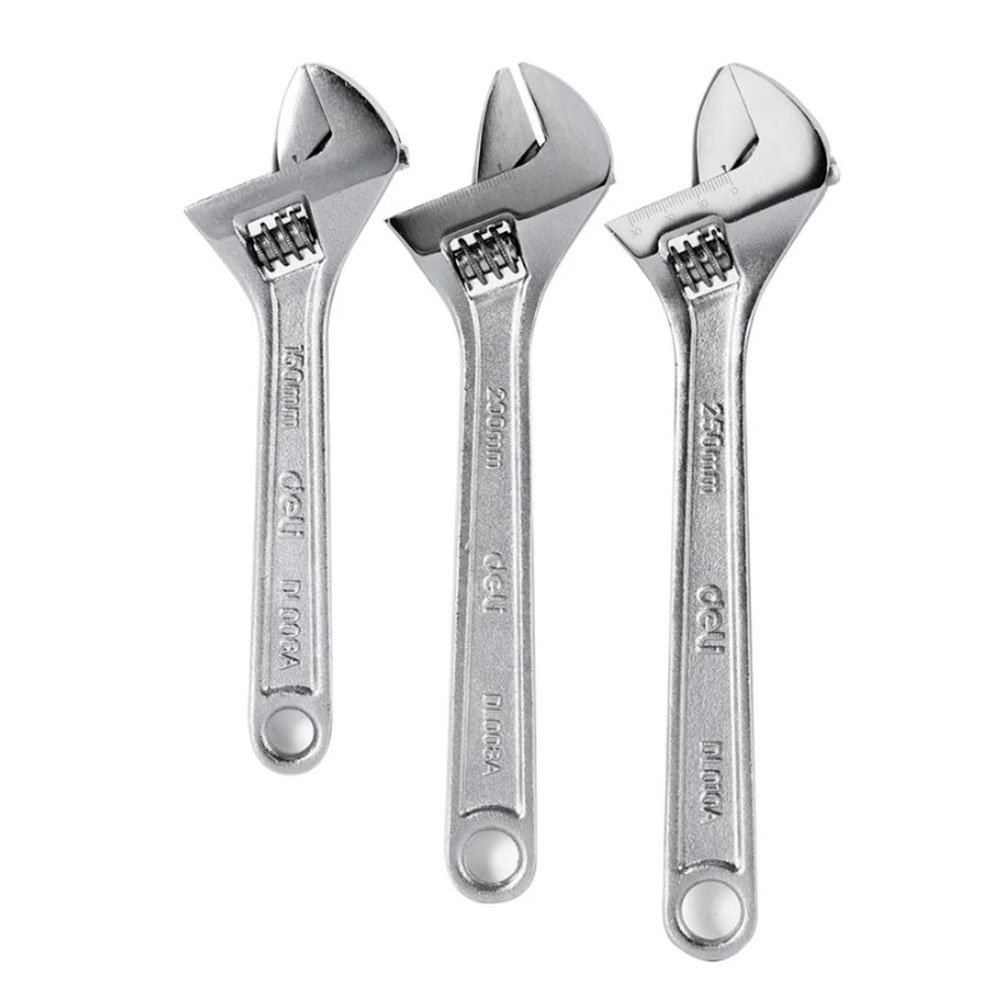 Набор из 3х разводных гаечных ключей DELI 150х200х250 мм - представляет собой комплект из трёх наиболее часто используемых гаечных ключей. В таком исполнении набор покрывает большинство потребностей для домашнего использования. Ширина раскрытия губок составляет: Ключ DL006A - 0-22мм, ключ DL008A - 0-28мм, ключ DL010Ф - 0-30 мм. Инструменты изготовлены из высококачественной углеродистой стали марки 45 и имеют специальное отверстие в рукояти для подвесного хранения, а специальное никелированное покрытие защитит инструменты от коррозии. Отлично подойдёт для домашнего использования, мастерской, автосервиса или гаража.