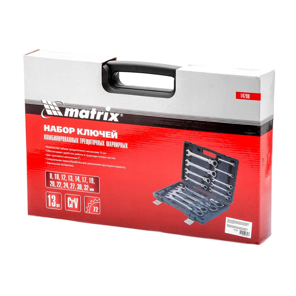 Набор ключей комбинированных трещоточных шарнирных 13 шт MATRIX - представляет собой высокопрочный инструмент для работ с шестигранным крепежом. Содержит популярный размерный ряд. Все модели изготовлены из Cr-V стали и обладают высокой стойкостью к износу. Шарнирный механизм придает значительное удобство при работе и обеспечивает доступ в трудные места.