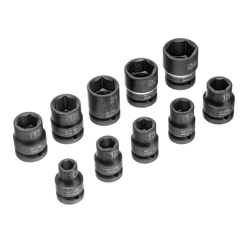 Набор шестигранных ударных торцевых головок 1/2 10-24 мм 10 шт STELS - включает в себя 10 насадок размером 10-24 мм с присоединительным квадратом 1/2 дюйма для монтажа и демонтажа крепежных элементов. Используются в качестве оснастки с электрическими или пневматическими гайковертами. Насадки выдерживают интенсивные ударные нагрузки, подходят для применения в автомастерской, на строительной площадке и в слесарном цеху.