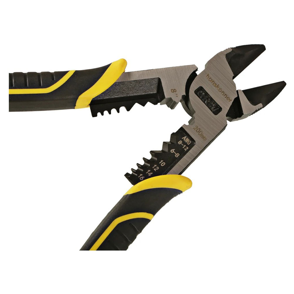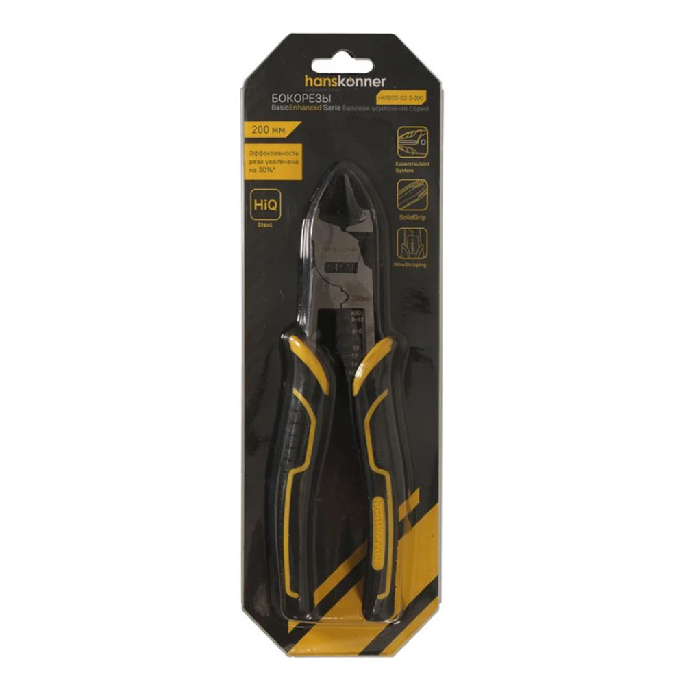 Бокорезы 200 мм Hanskonner - изготовлены из высококачественной закалённой стали, что обеспечивает высокий ресурс. Эффективность реза увеличена на 30% по сравнению со стандартными пассатижами. Сбалансированная твердость рабочих поверхностей 61-63 HRC обеспечивает долговечность заточки и снижение усилия при работе. EccentricJoint System (эксцентриковый шарнир) обеспечивает полную передачу силы на инструмент. Встроенный кольцевой гаечный ключ для специализированных работ. Двухкомпонентные рукоятки SolidGrip из TPR материала удобны для захвата и обладают повышенной стойкостью к внешнему воздействию.