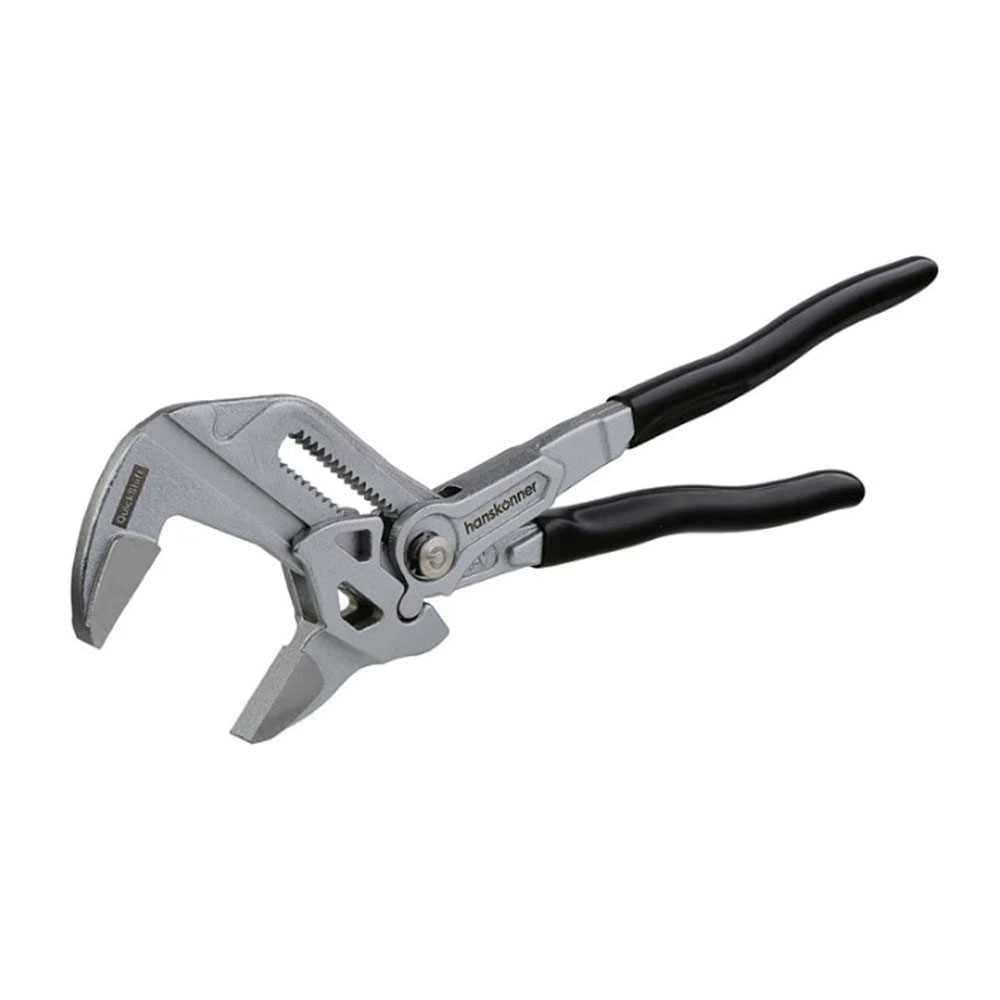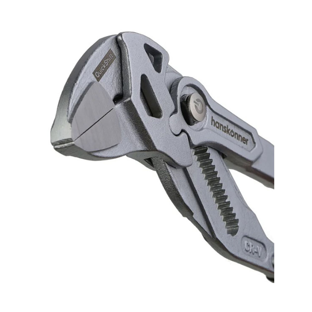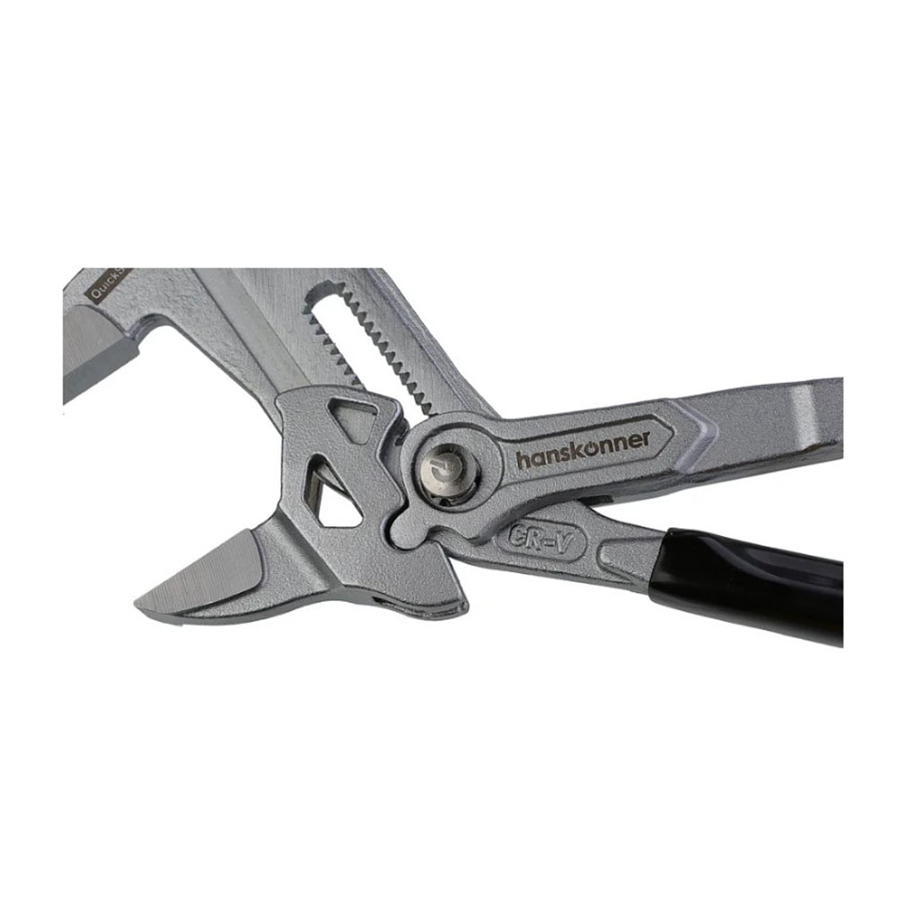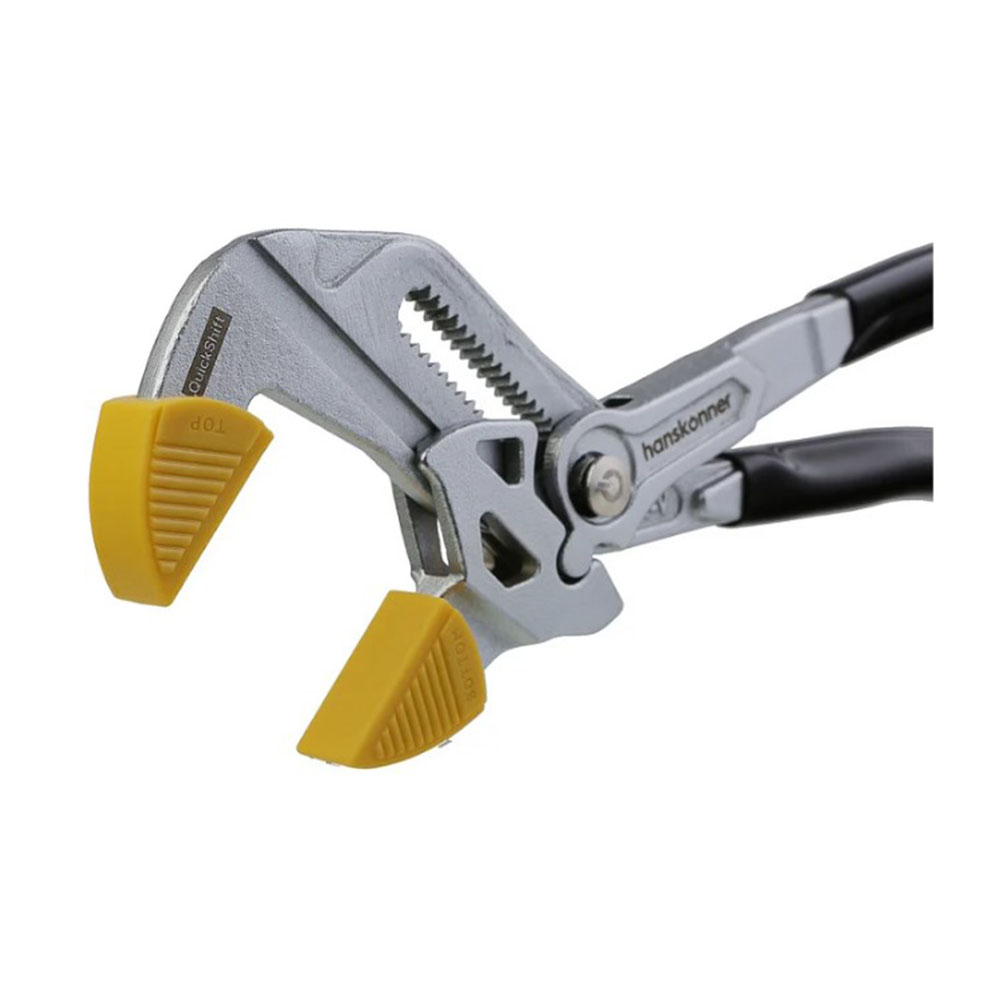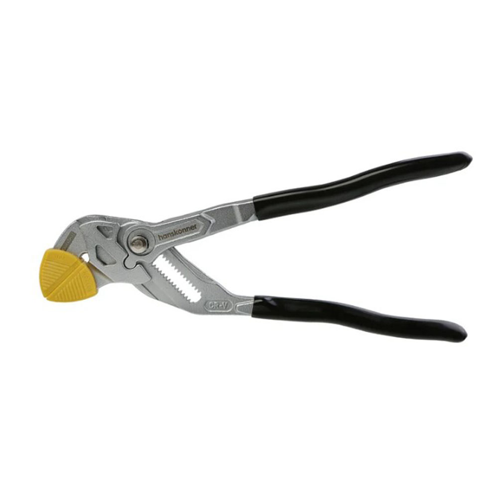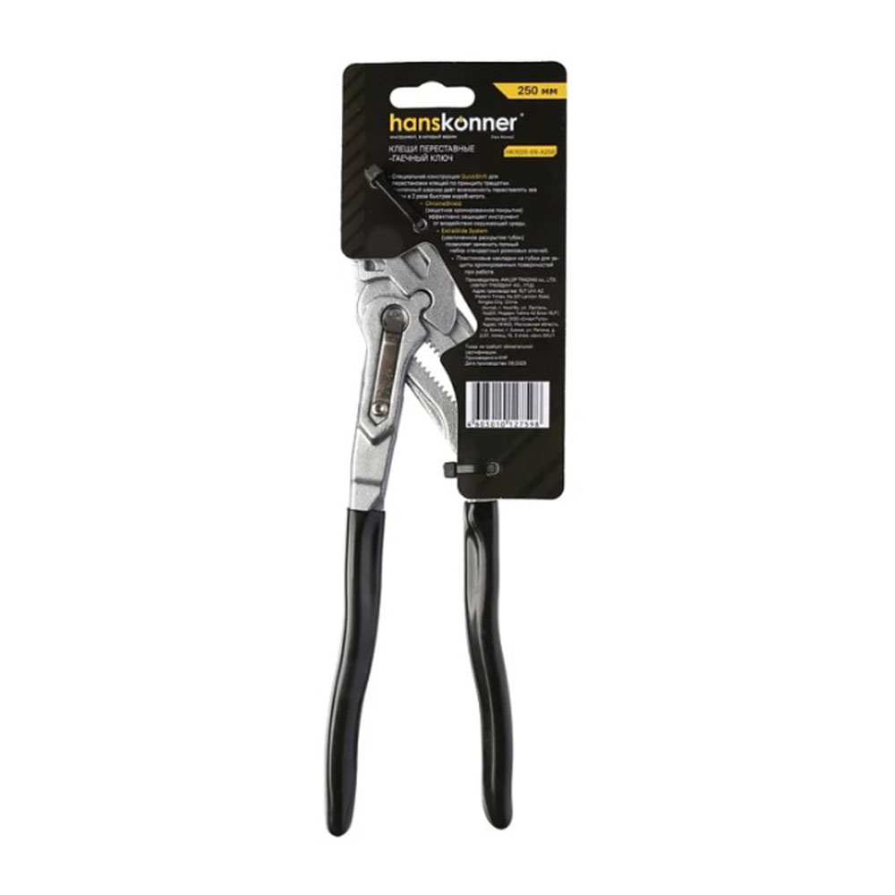 Клещи переставные 250 мм кнопочный шарнир без засечек Hanskonner - позволяет переставлять клещи по принципу трещотки (без перехвата). Кнопочный шарнир позволяет переставлять зев губок в 2 раза быстрее коробчатого. Изготовлены из высококачественной CrV стали, что обеспечивает высокий ресурс. Твердость рабочих поверхностей составляет 50 HRC. Это поддерживает сохранность рабочих граней. ExtraWide system (увеличенное раскрытие губок) позволяет заменить полный набор стандартных рожковых ключей. Раскрытие на 49% шире стандартного. ChromeShield (защитное хромированное покрытие) эффективно защищает инструмент от воздействия окружающей среды. Эргономичные утолщённые ПВХ рукоятки SolidGrip удобны для захвата и обладают повышенной стойкостью к внешнему воздействию благодаря гладкой но нескользящей поверхности. Пластиковые накладки на губки для защиты хромированных поверхностей при работе.