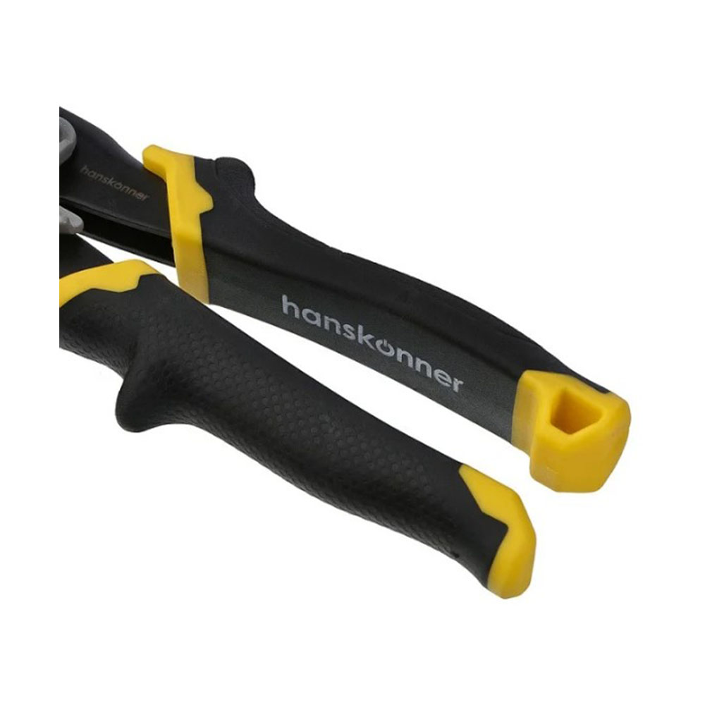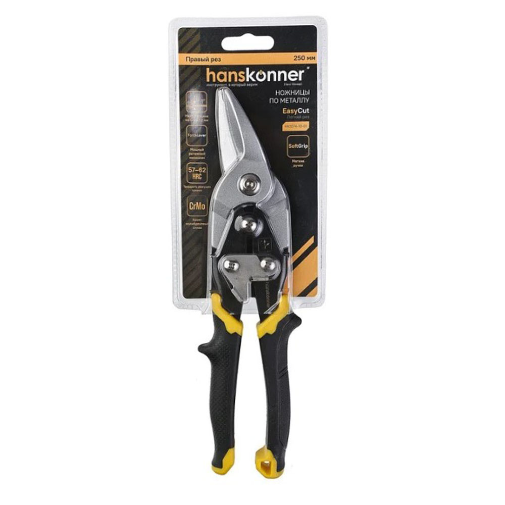 Ножницы по металлу правые Hanskonner - мощные и надежные ножницы по металлу EasyCut. Правй рез. Изготовлены из высококачественной хромомолибденовой стали с закалкой лезвий (57-62 HRC) для исключительной износостойкости. Режущие кромки с насечками обеспечивают надежный захват материала без проскальзывания. Эргономичные рукоятки гарантируют удобный и безопасный хват.