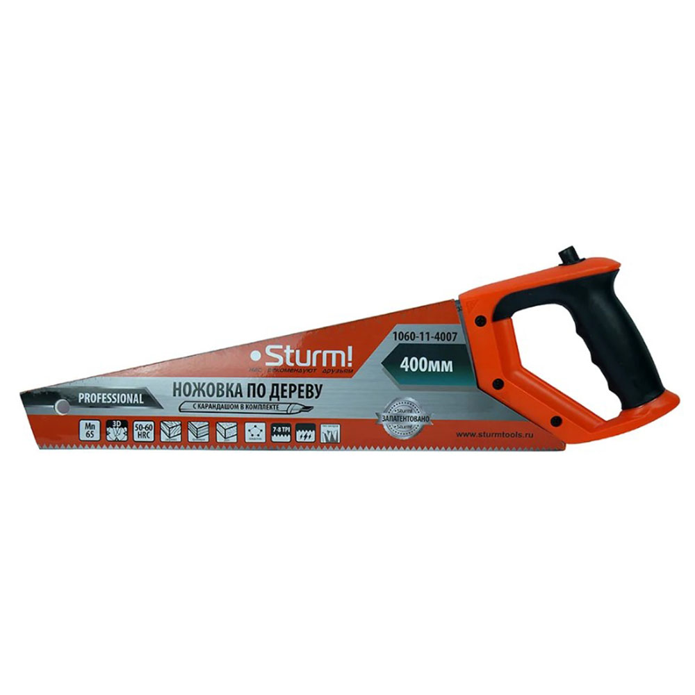 Ножовка по дереву с карандашом 400 мм Sturm 1060-11-4007 - находит применение в мастерской или при ремонтных/строительных работах. Инструмент удобен в использовании за счет двухкомпонентной рукоятки, которая не скользит в ладони. Карандаш располагается в полости рукояти.