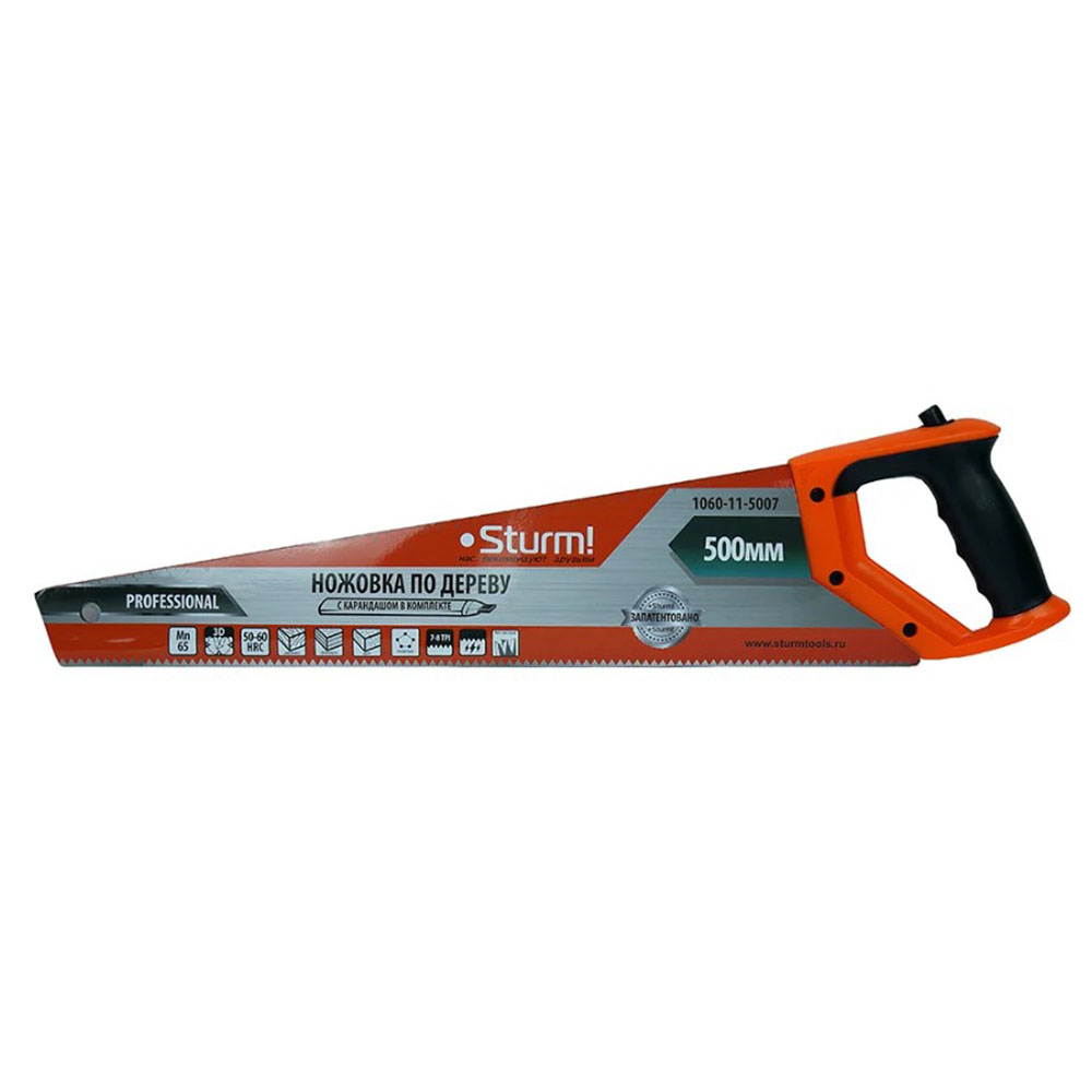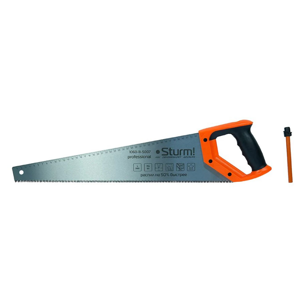 Ножовка по дереву с карандашом 500 мм Sturm - удобный комплект, при помощи которого можно размечать и распиливать на части деревянные заготовки. Для комфорта в работе рукоять выполнена из двухкомпонентного материала, что упрощает использование инструмента.