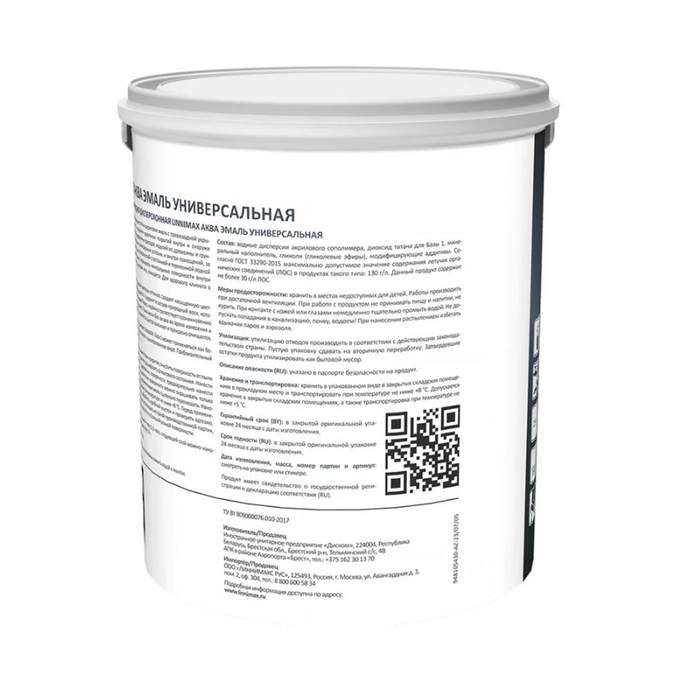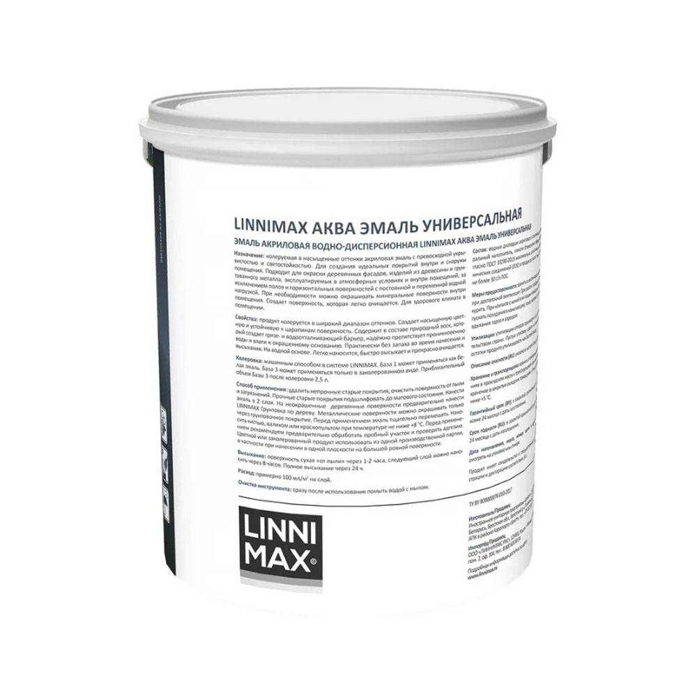 Эмаль универсальная акриловая Атмосферостойкая база 1 Белая 2,5 л LINNIMAX Аква - водоразбавляемая акриловая колеруемая в насыщенные и яркие оттенки эмаль с превосходной укрывистостью и светостойкостью. Применяется для окраски деревянных элементов фасада, изделий из древесины и предварительно загрунтованного металла, эксплуатируемых в атмосферных условиях и внутри помещений, за исключением полов и горизонтальных поверхностей с постоянной и переменной водной нагрузкой. При необходимости можно окрашивать минеральные поверхности внутри помещения.