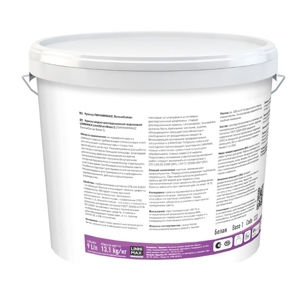 Краска для потолков и стен 9 л База 1 LINNIMAX LinniSilan - глубокоматовая интерьерная краска премиум-класса. Безупречное покрытие даже при боковом скользящем свете и сложных условиях освещения. Оптимальное решение для потолков. Идеально при любом свете: особая формула позволяет нанести покрытие без видимых стыков даже на потолках и стенах очень большой площади. Это особенно важно для помещений с нестандартными условиями освещения, например, лестничных пролетов и коридоров с боковым скользящим светом, помещений с панорамными окнами. Максимальная укрывистость: самый высокий уровень укрывистости среди всех интерьерных красок LINNIMAX позволяет создать равномерное покрытие высочайшего качества с плотной текстурой всего за один слой, что в некоторых условиях дает экономию материала и усилий при ремонте почти в два раза. Глубокоматовая поверхность: покрытие практически не отражает свет и не создает бликов, таким образом возможные недостатки в подготовке поверхности становятся менее заметными.
