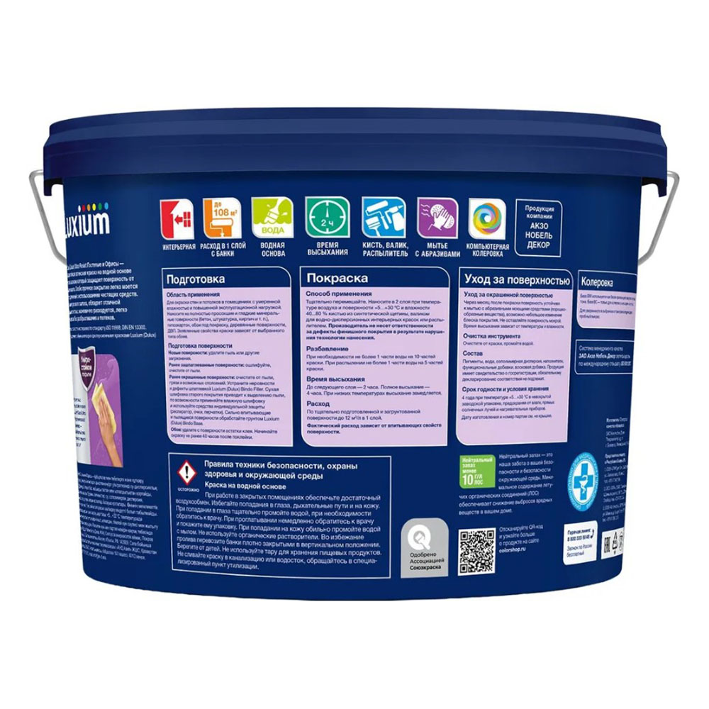 Краска Гостиные и офисы 9 л база BС Dulux/Luxium Ultra Resist - Предназначена для нанесения на полностью просохшие минеральные поверхности (бетон, штукатурка, кирпич), гипсокартон, обои под покраску. Рекомендуется для окраски помещений с умеренной влажностью и высокой эксплуатационной нагрузкой, таких как офисы, коридоры, прихожие, рестораны, отели, приемные, медучреждения. Сертифицирована для применения в детских и лечебно-профилактических учреждений. Для внутренних работ.
