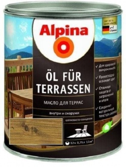 Alpina Öl für Terrassen ухаживает за древесиной и отлично защищает её от влаги и загрязнений. Этот материал стоек к истиранию, он освежает цвета и при этом сохраняет уникальную текстуру деревянных террас, полов и других предметов интерьера. Alpina Öl für Terrassen изготавливается на водной основе и поэтому может применяться без опасений для воздуха в помещениях, так как масло практически не имеет запаха как при его нанесении, так и при высыхании. Alpina Öl für Terrassen идеально для использования как для наружных так и для внутренних работ.