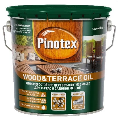 Атсмоферостойкое колеруемое деревозащитное масло для террас и садовой мебели.Используется для наружного применения. Создает надежный барьер для террас и садовой мебели.Защитить мебель на улице задача не из легких, но террасное масло для дерева справится с проблемой. После несложного нанесения, террасное масло Пинотекс глубоко пропитывает деревянные элементы и подчеркивает естественный природный рисунок.Масло легко наносится, полностью впитывается в поверхность и подчеркивает естественную красоту древесины.