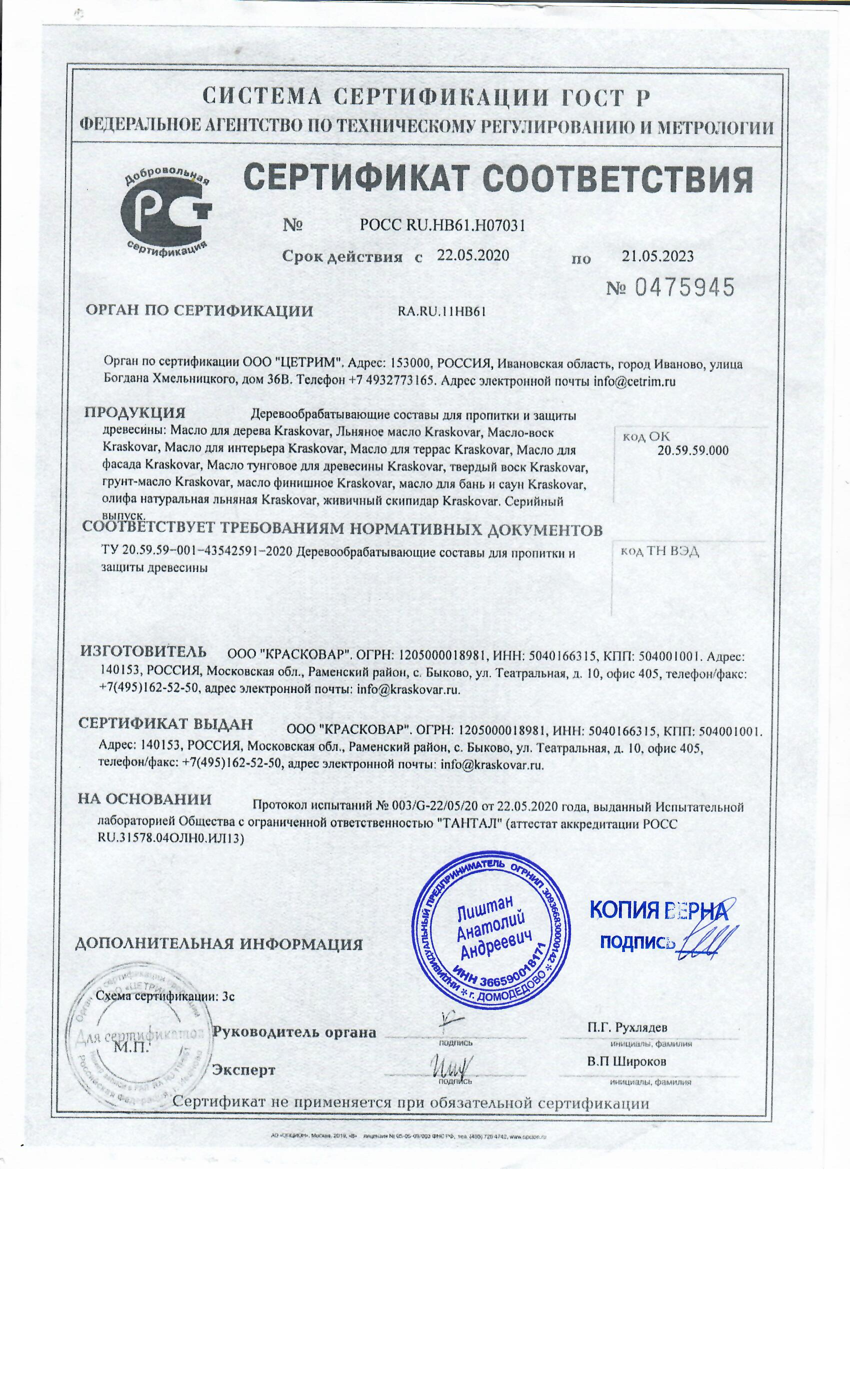 100% Тунговое масло Kraskovar Tungo Oil является натуральным, экологичным продуктом. Предназначено для пропитки различных пород древесины, подходит для всех типов деревянных поверхностей и строений, кухонной мебели, детских игрушек, беседок и веранд и др. Натуральные компоненты масла, глубоко проникают в основание древесины, не образуя при этом пленку, что повышает устойчивость обработанной поверхности к воздействию влаги, Уф-лучей, плесени и грибка, спиртосодержащих компонентов, грязи и пыли. Выделяет и подчеркивает красоту и текстуру древесины. Масло обладает эластичностью, не растрескивается при естественных деформациях. При нанесении образует матовую износостойкую поверхность. Применяется для внутренних и наружных работ.