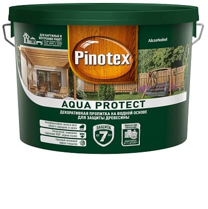 Декоративно-защитная пропитка для древесины на водной основе. Пропитка Pinotex Aqua Protect легко наносится, быстро впитывается и высыхает. Образует прочное эластичное покрытие с красивым сатиновым эффектом. Пропитка для внутренних и наружных работ. Не рекомендуется использовать для горизонтальных поверхностей.Базу под колеровку (CLR) использовать только в колерованном виде.Богатая цветовая палитра – 120 оттенков. Подчеркивает естественную структуру древесины.