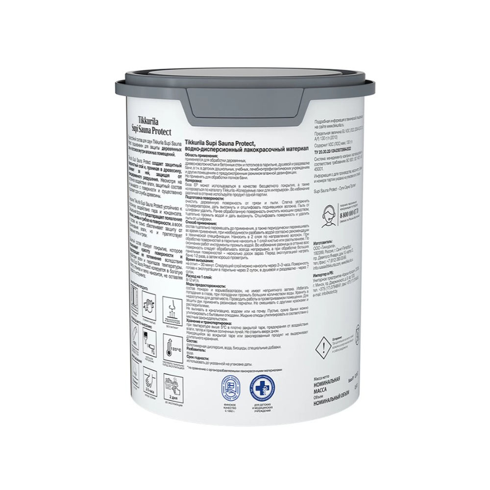 Защитный состав для саун полуматовый 0,9 л Tikkurila/Tikkivala Supi Sauna Protect - колеруемый защитный состав на акрилатной основе. Предназначен для защиты поверхностей во влажных помещениях, образует грязе – и водоотталкивающую поверхность. Содержит компоненты защищающие обработанную поверхность от синевы и плесени. Применяется для покрытия деревянных, древесноволокнистых и бетонных поверхностей, в особенности, для обработки стен и потолков в парильне, умывальной и раздевалке бани. Не применять для обработки полков бани.