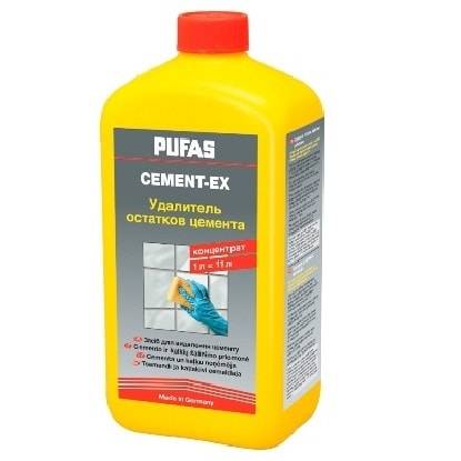 PUFAS Cement-Ex Удалитель остатков цемента устраняет быстро и без труда известковые и цементные остатки со всех, устойчивых к кислотному воздействию, видов глазурованной и керамической плитки, а также известковые отложения на кранах и смесителях, ваннах и душевых кабинах. Перед применением поверхность проверить на чувствительность, т. к. некислотоупорные поверхности могут быть повреждены (мрамор, искусственный камень и т. п.). Сырьевая основа: неорганическая кислота, поверхностно-активные вещества