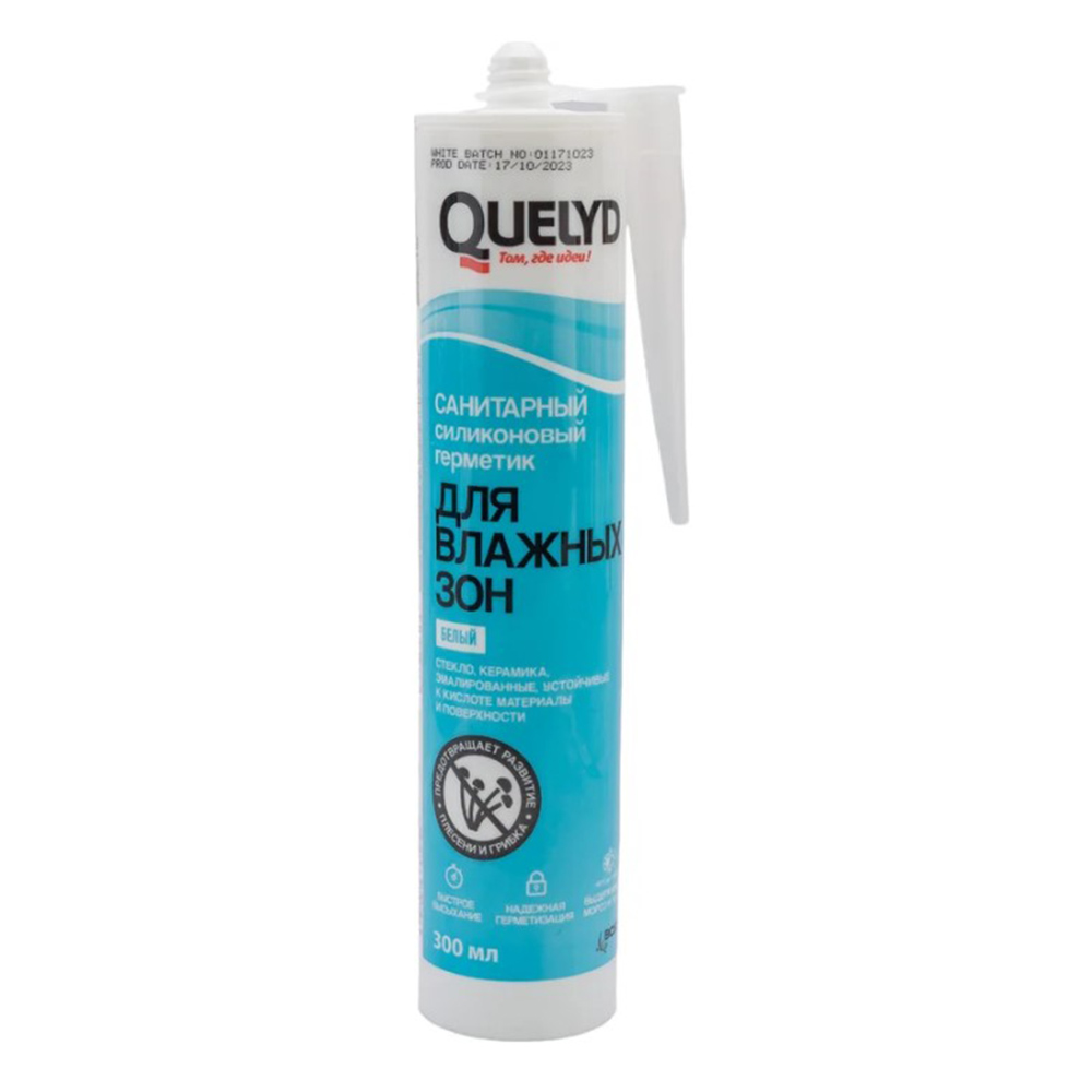 Герметик силиконовый санитарный Белый 300 мл QUELYD - однокомпонентный ацетатный силиконовый герметик. Отверждается за счет реакции с влагой воздуха. Разработан для герметизации и ремонта - швов в: ванных комнатах, душевых, сан.узлах, парных, саунах, бассейнах; Для герметизации швов различных материалов: стекло, плитка, керамика, устойчивых к коррозии металлов, эмаль, пропитанные, лакированные или покрашенные деревянные поверхности и на некоторых пластмассах.