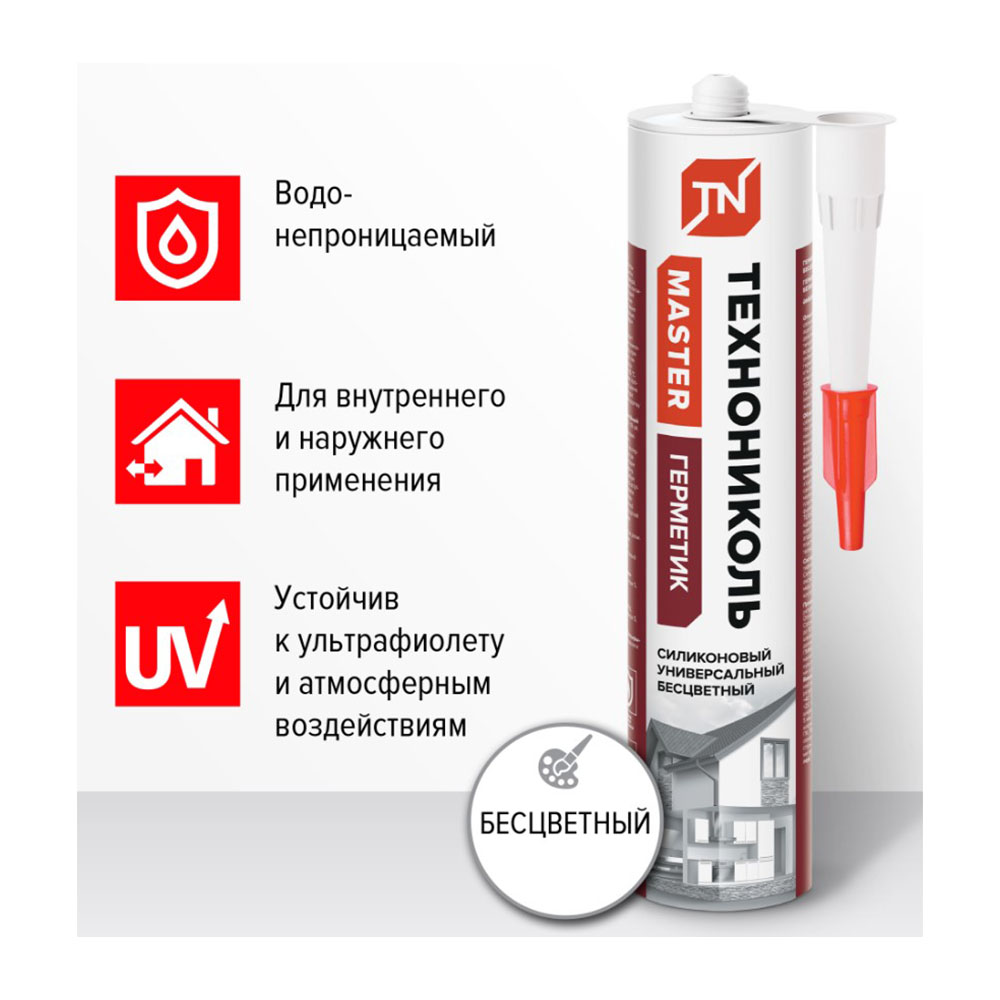 Герметик универсальный силиконовый Бесцветный 280 мл ТЕХНОНИКОЛЬ - это силиконовый герметик, который при взаимодействии с влагой воздуха формируется в прочную эластичную резину. Стоек к ультрафиолету и атмосферным воздействиям. Температура эксплуатации от минус 40°С до плюс 80 °С.