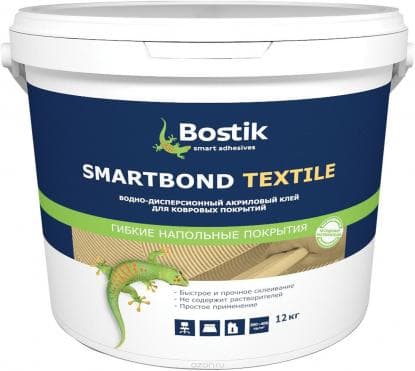SMARTBOND TEXTILE - водно-дисперсионный акриловый клей для ковровых покрытий с высокой начальной и конечной клеящей способностью. Предназначен для укладки гибких текстильных напольных покрытий: иглопробивных покрытий с основой или без, ковровых покрытий со вспененной или полиэстровой основой, ковровых синтетических покрытий «Action Вас». Может использоваться для укладки бытового ПВХ линолеума. Предназначен для использования внутри помещения по впитывающим минеральным основаниям. Не рекомендуется для укладки натурального линолеума.