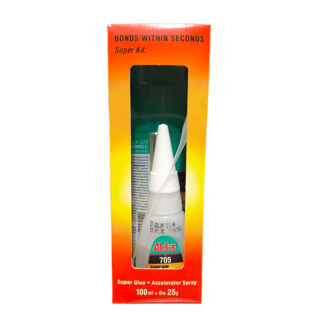 Клей двухкомпонентный Akfix 705 100 мг+25 г, состоит из полимеризующегося клея и аэрозоля-активатора. Комплект применяется для монтажа и ремонта деталей из МДФ, дерева, кожи, резины. Благодаря высокой вязкости клея возможно проведение работ на вертикальных поверхностях.