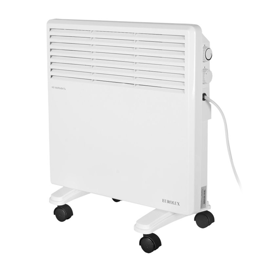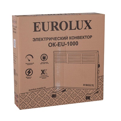 Конвектор ОК-EU-1000 Eurolux может быть установлен напольно на специальные ножки или настенно. Данный обогреватель имеет два режима мощности: 500 и 1000 Вт. Конвектор оснащен механическим термостатом для установки необходимой температуры обогрева. Опорные ножки, оснащенные колесами, упрощают перемещение обогревателя по помещению.