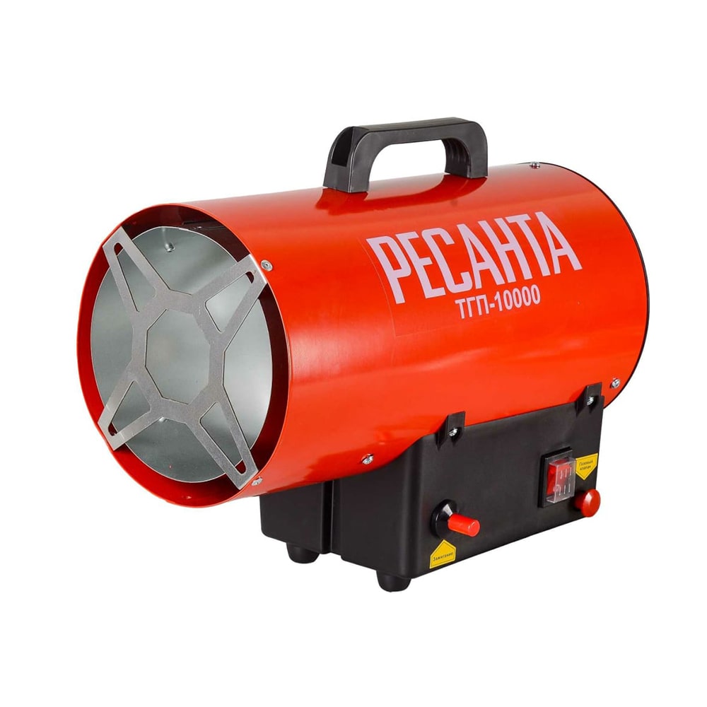 Тепловая пушка Ресанта ТГП-10000, имеющая мощность 10 кВт, позволит быстро обогреть помещение площадью до 100 м2, а мобильное исполнение и небольшой собственный вес, составляющий менее 6 кг, делают устройство максимально удобным для транспортировки. Аппарат работает на сжиженном пропане или бутане, поставляемых в балонах, для подключения к которым в комплекте предусмотрен редуктор и соединительный шланг. Пушка абсолютно безопасна в эксплуатации и не выделяет при горении никаких вредных веществ и неприятных запахов, что делает ее пригодной для использования как в промышленных и производственных помещениях, так и в местах, где регулярно присутствует большое количество людей, например, вокзалы, аэропорты или холлы гостиниц. Присутствие в воздухе запаха при работе прибора сравнимо с обычной бытовой газовой плитой, используемой в каждом доме, при этом, чтобы его различить, необходимо находиться на небольшом удалении от устройства.